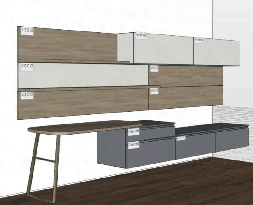 Il modello Composizione 30 in foto ha una larghezza che va da 351 a 400 cm, risultando quindi ideale per locali di svariate dimensioni.