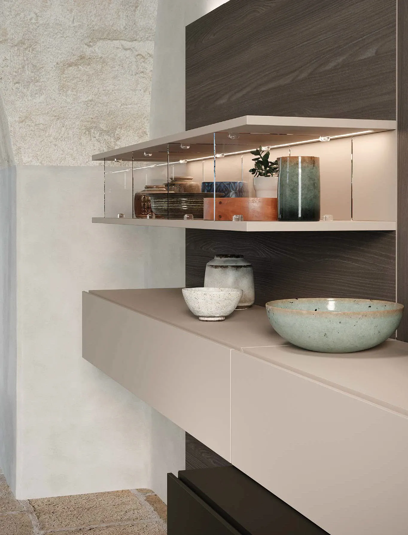 Composizione dinamica e moderna di produzione artigianale di alta qualità- La base sospesa, il cassettone e la mensola sono in finitura laccato opaco (sia fuori che internamente) e rispettivamente nei colori Moka e Cappuccino, mentre la Boiserie è in finitura materica Olmo Brown-