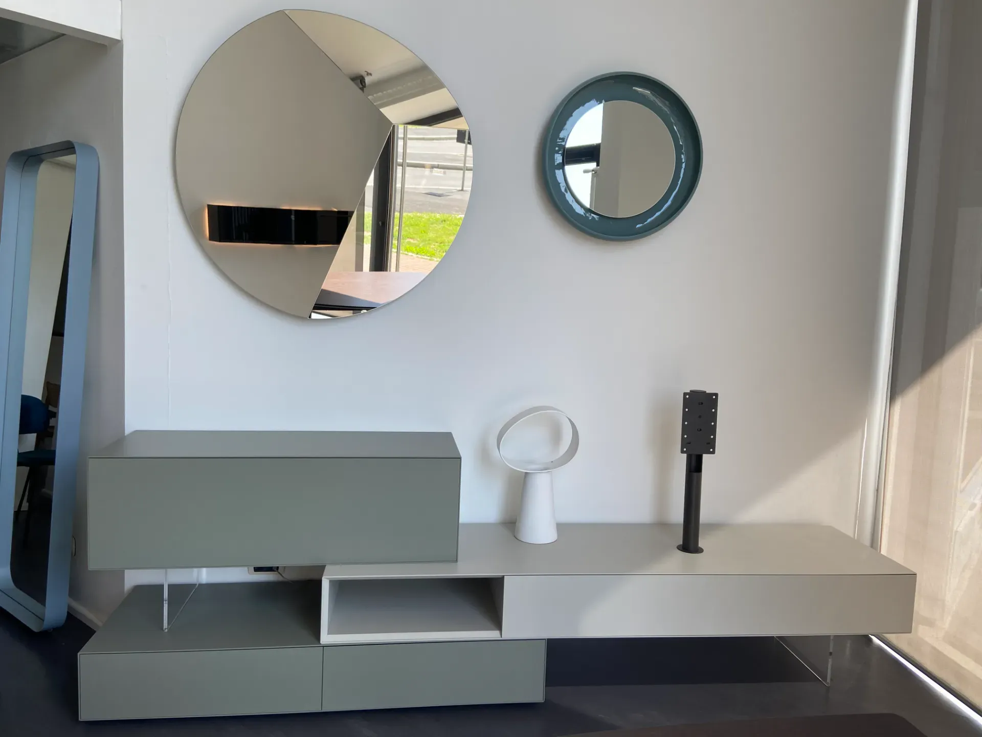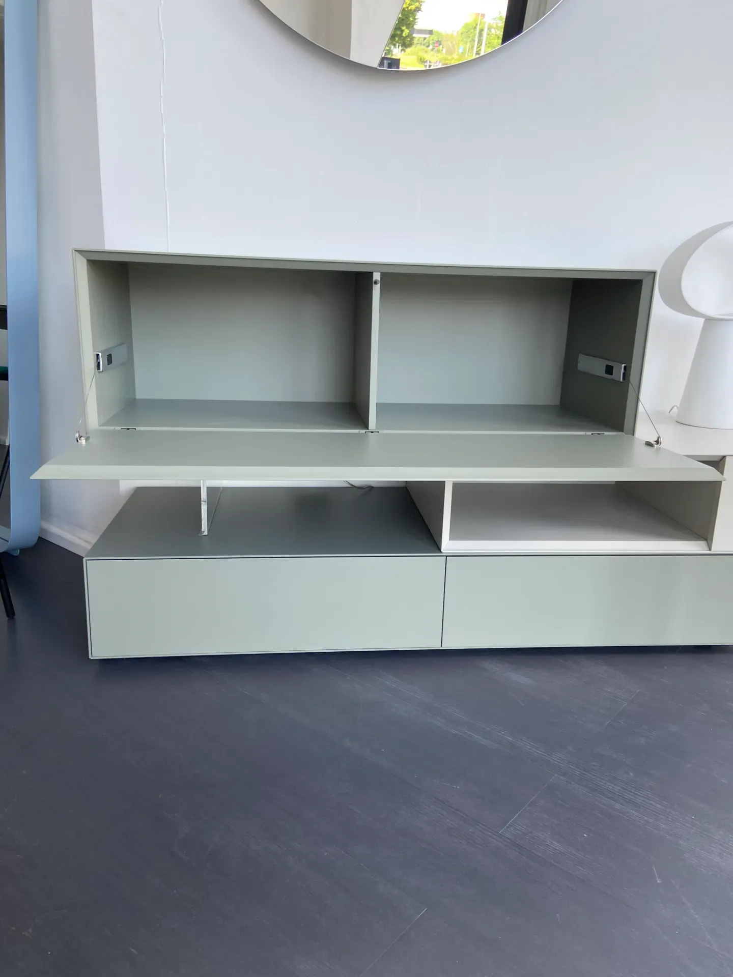 Lo stile essenziale ed elegante, rende questa mobile tv perfetto per diversi contesti di arredo, grazie anche alla finitura laccata salvia abbinata al neutro grigio.