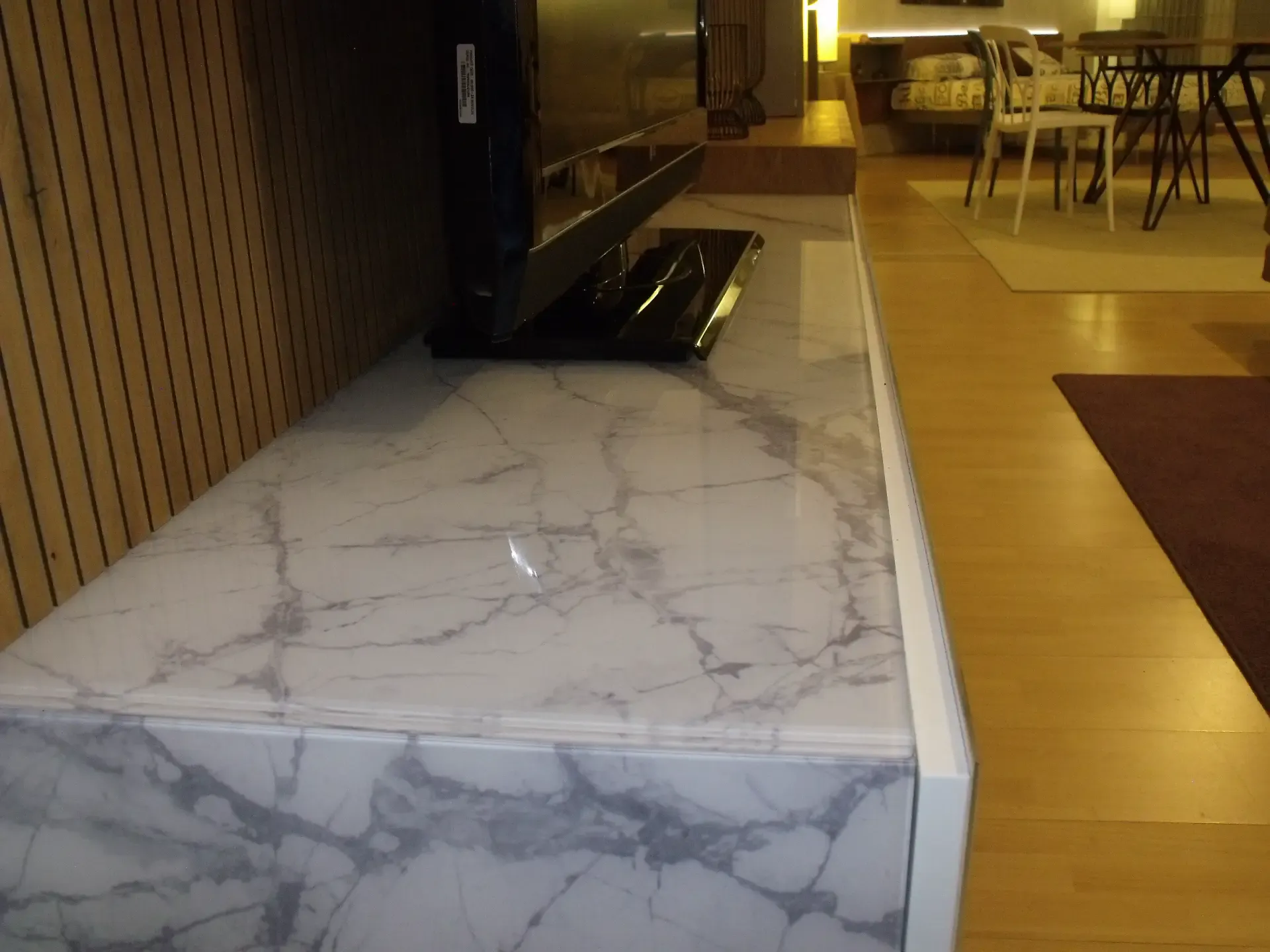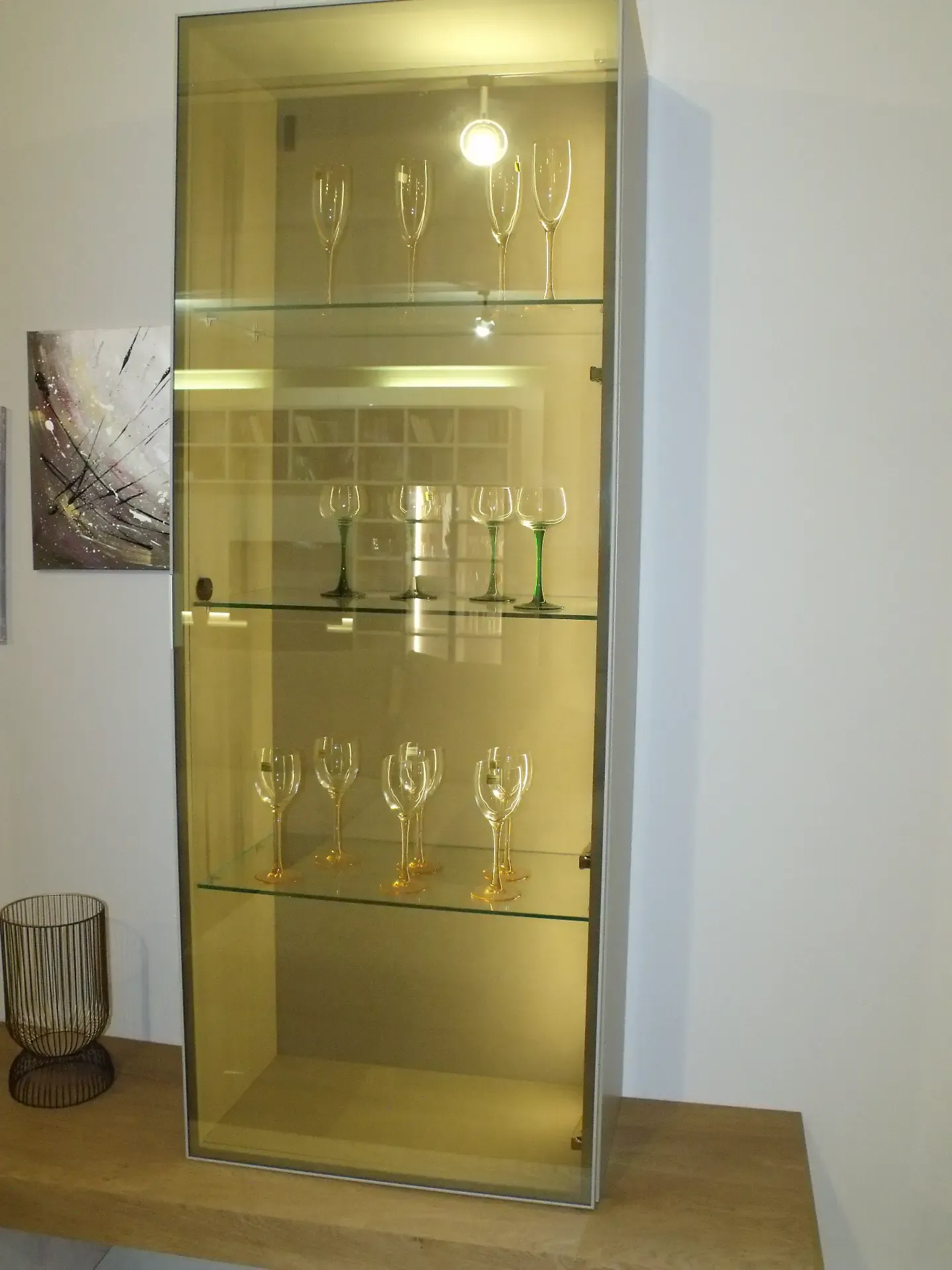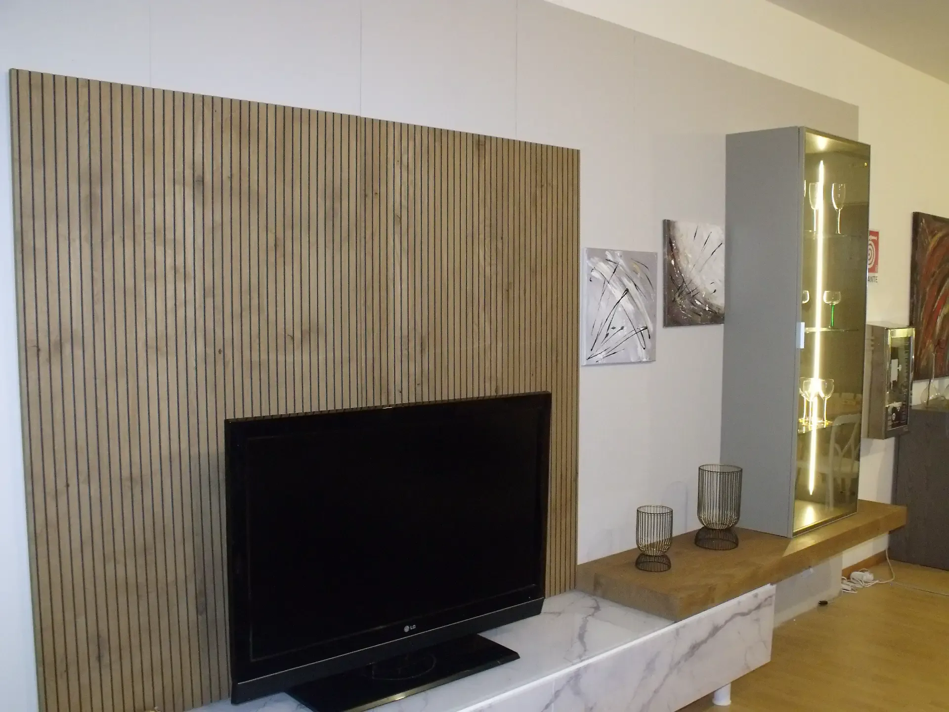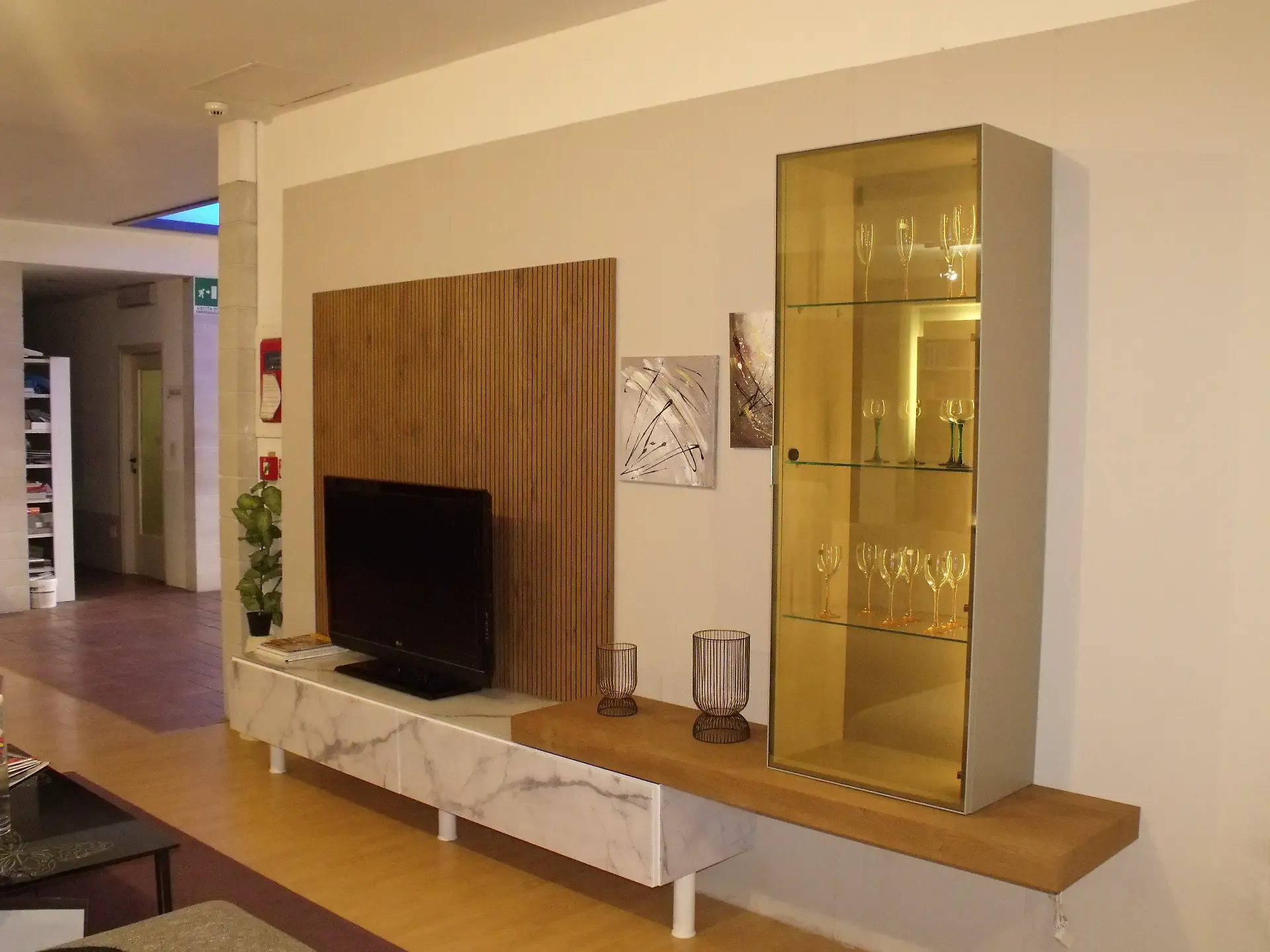 Soggiorno Horizon di Mobil Gam composto da base da 240 cm sospesa in vetro effetto marmorizzato, mensola in rovere old e pensile vetrina laccata internamente tortora con luce led.
