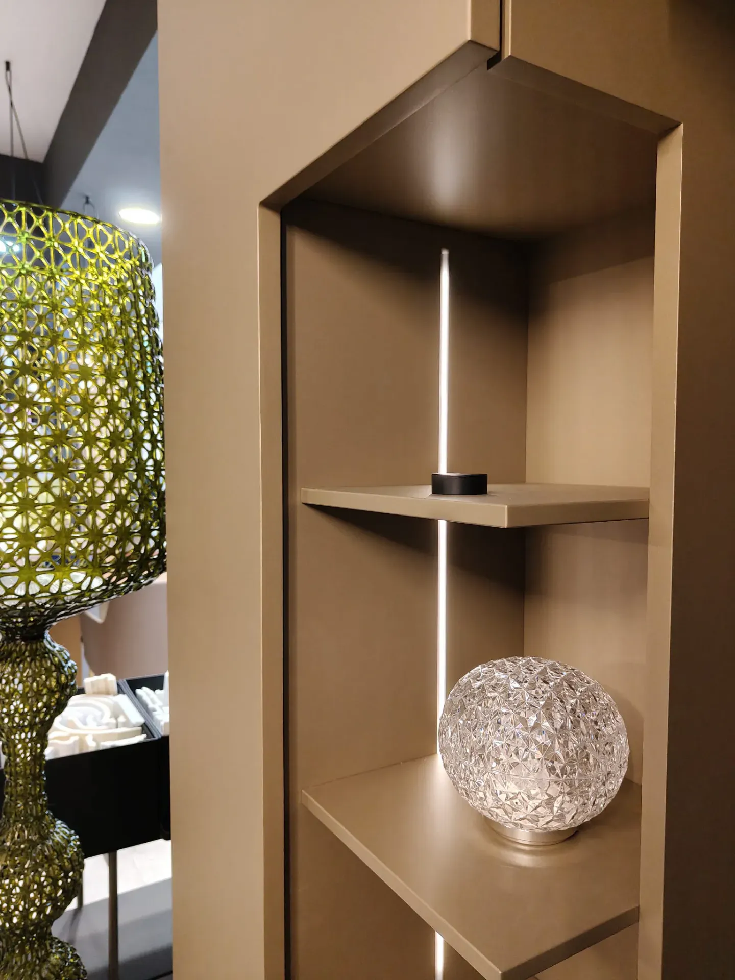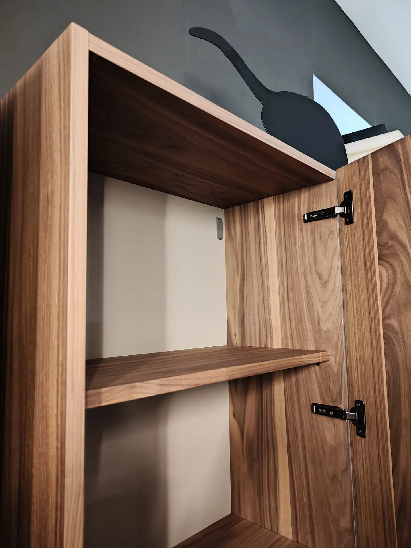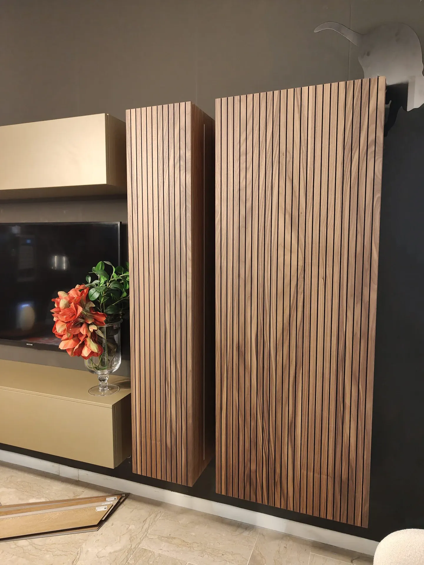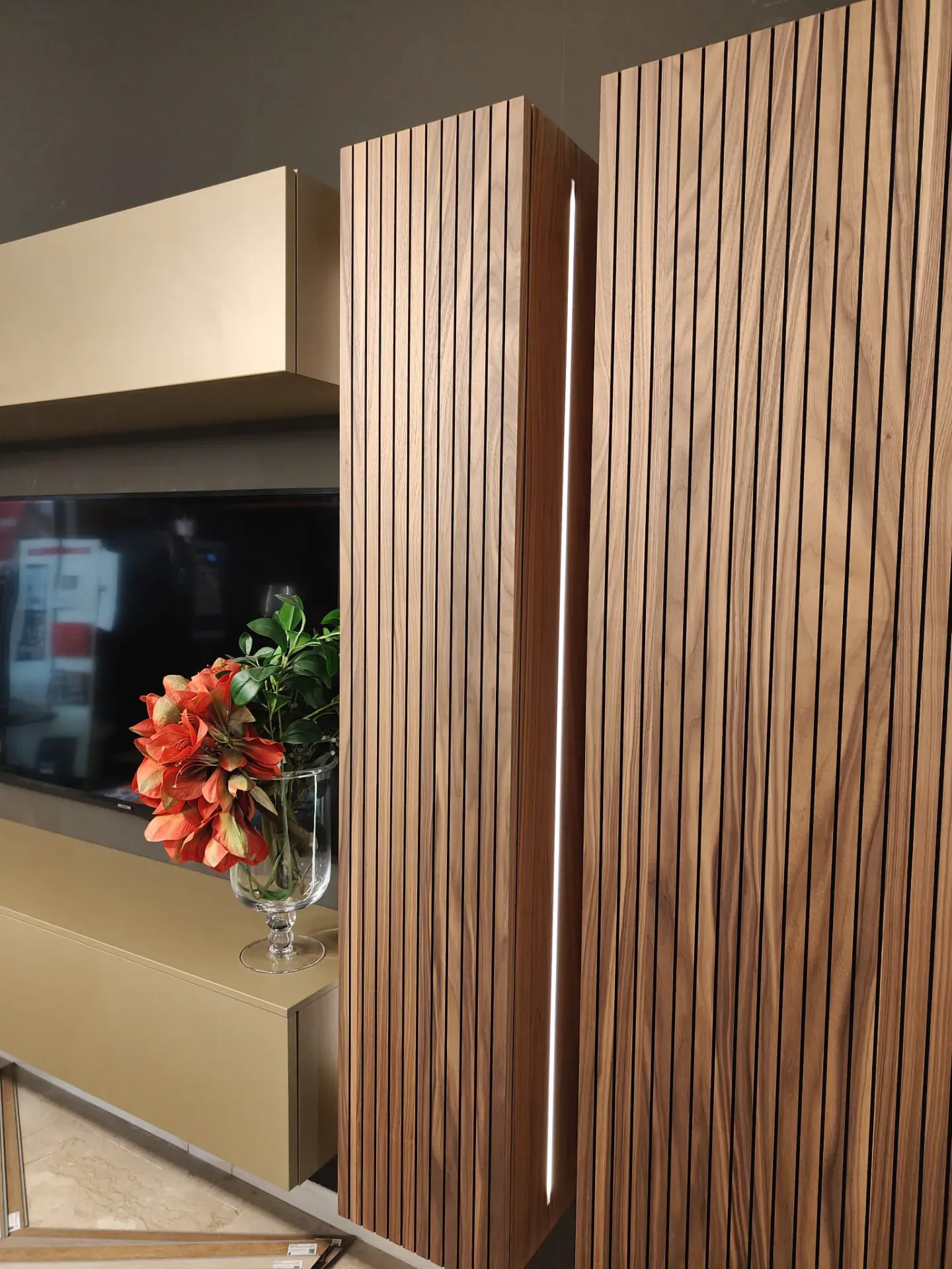 A interrompere la linearità, due colonne verticali in essenza legno introducono calore e movimento grazie alla loro texture rigata, creando un contrasto elegante con il fondo scuro della parete.