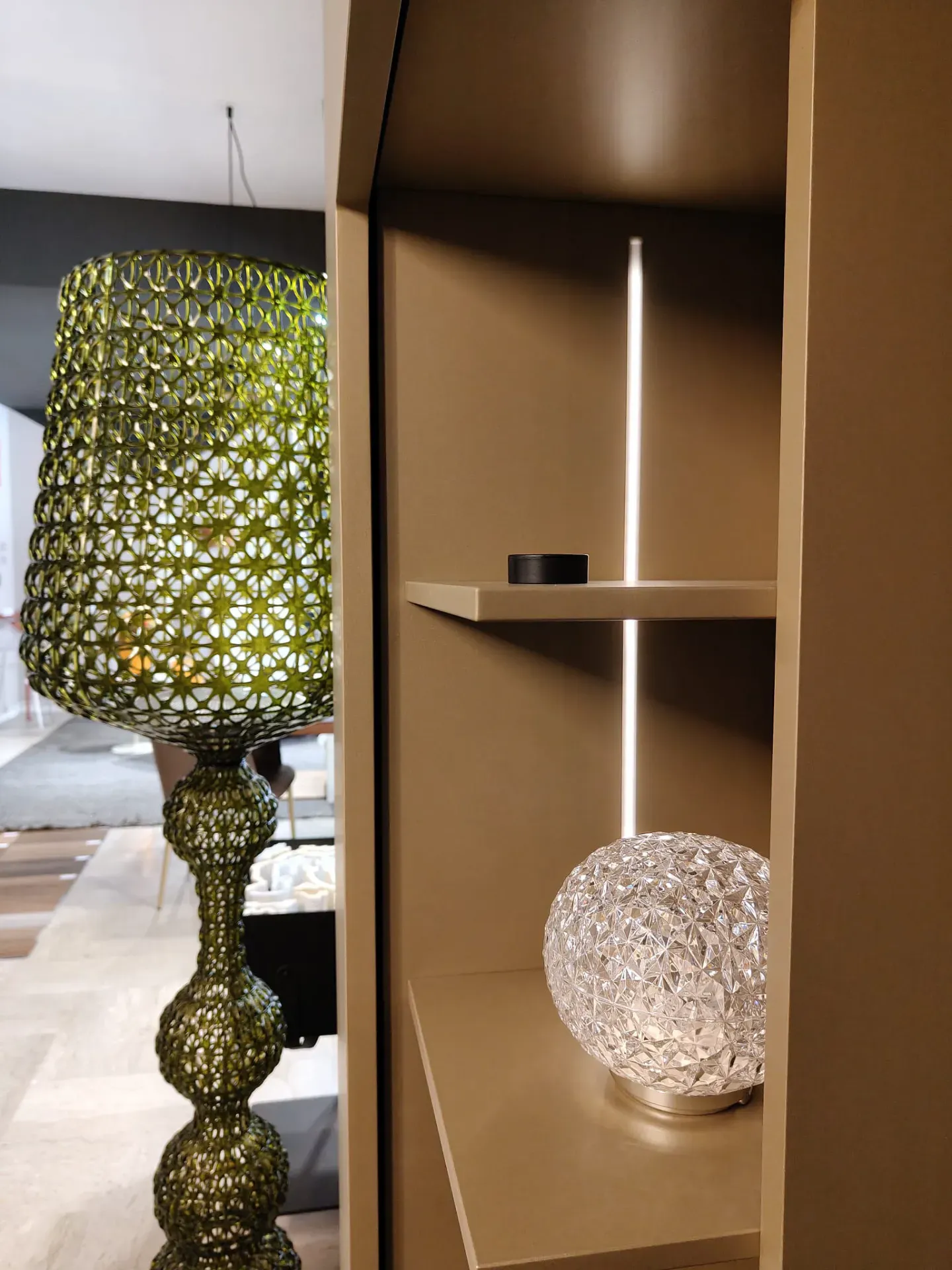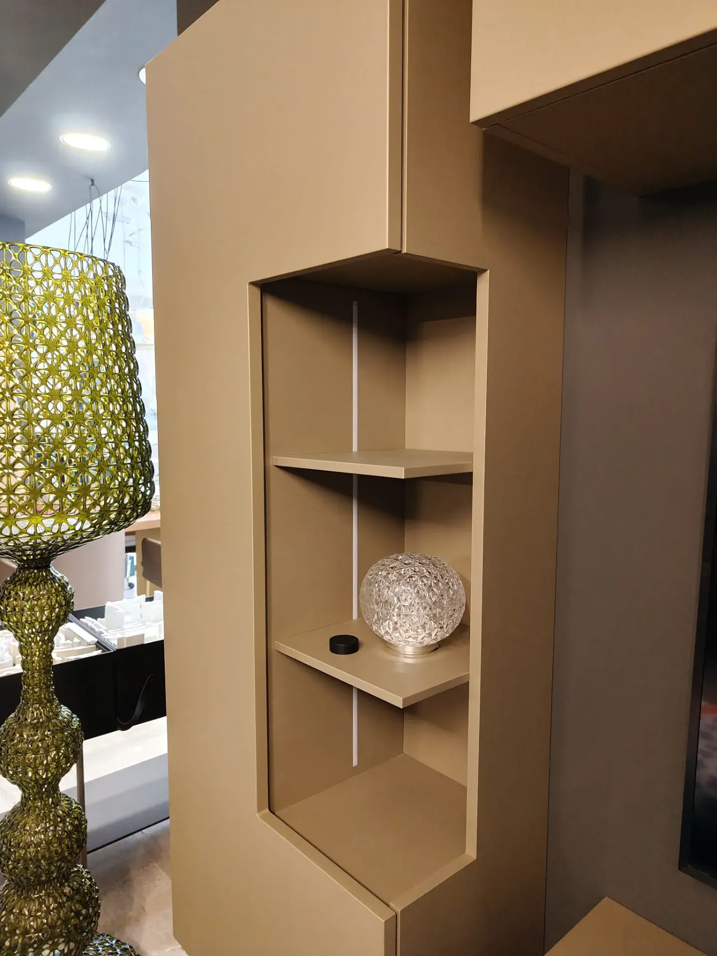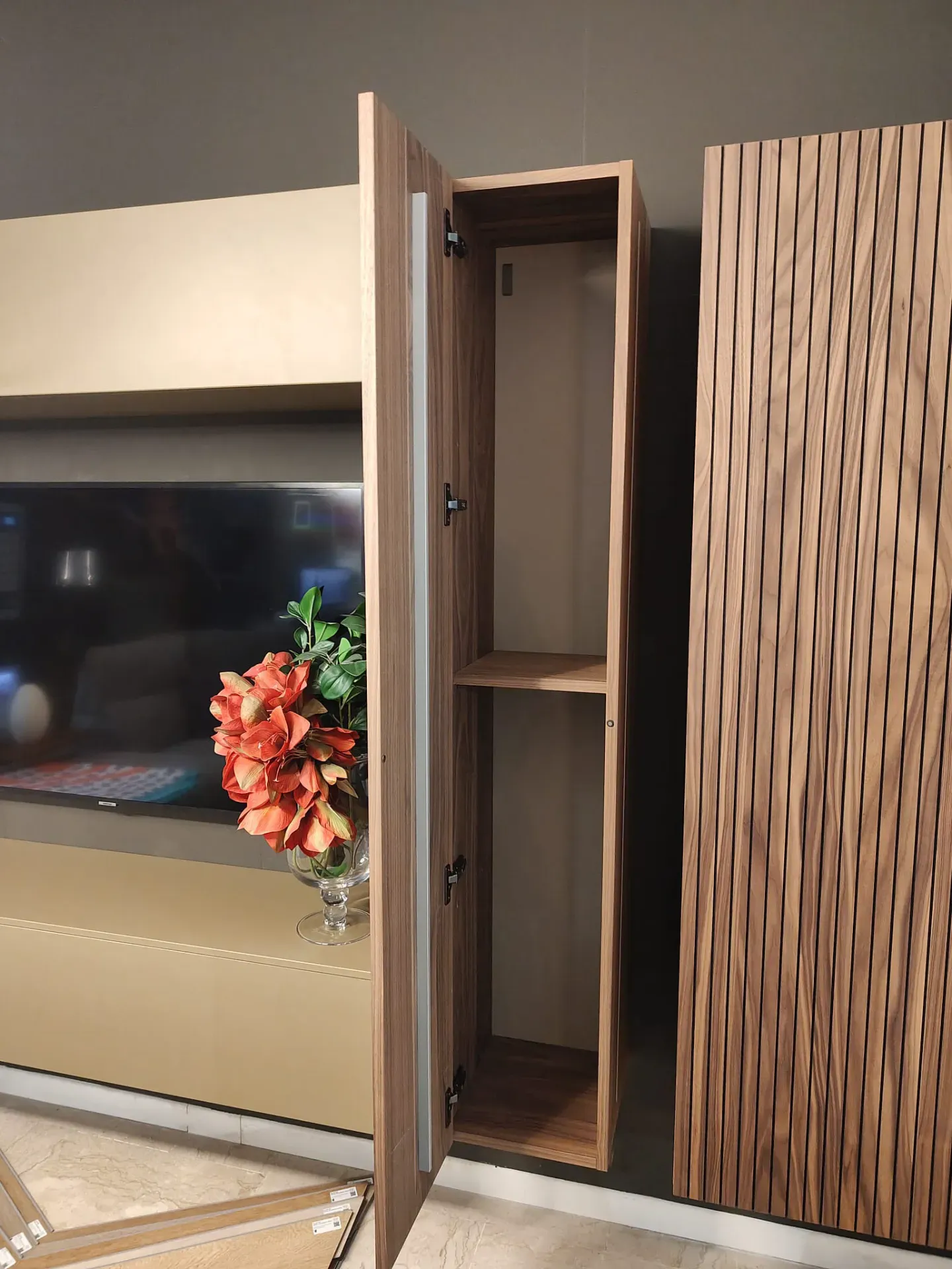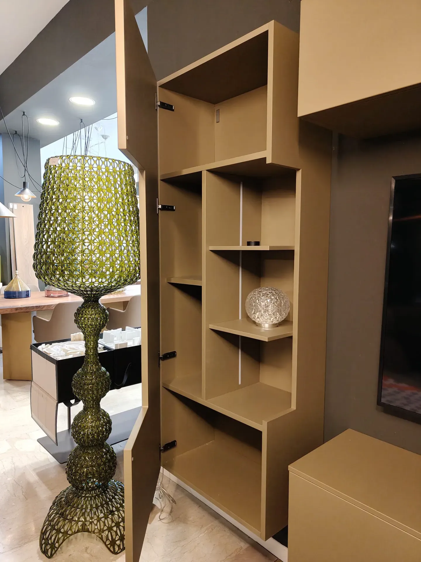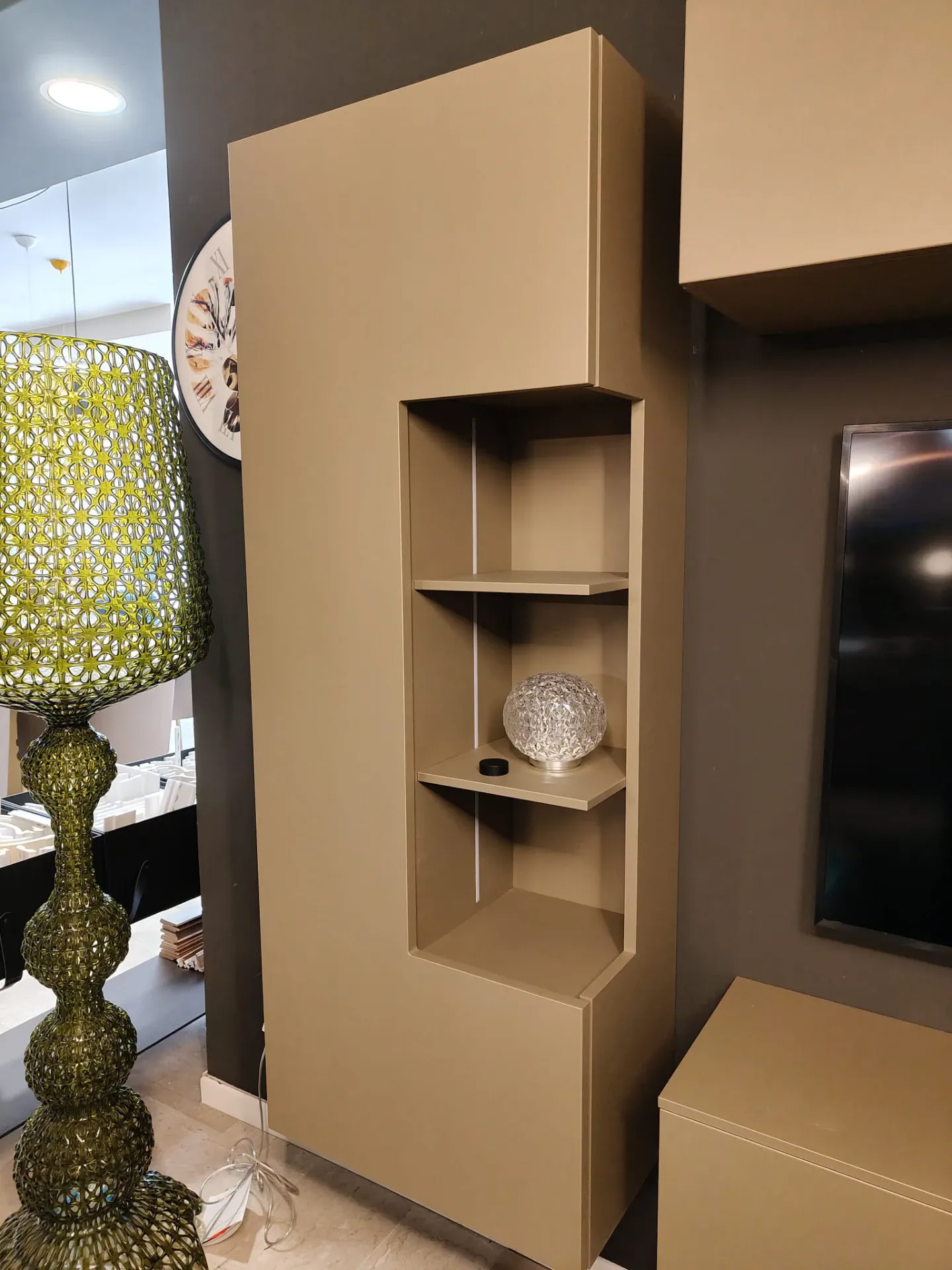 Sul lato opposto, un modulo con vani a giorno aggiunge dinamismo e offre spazio per oggetti decorativi, contribuendo a personalizzare l insieme.