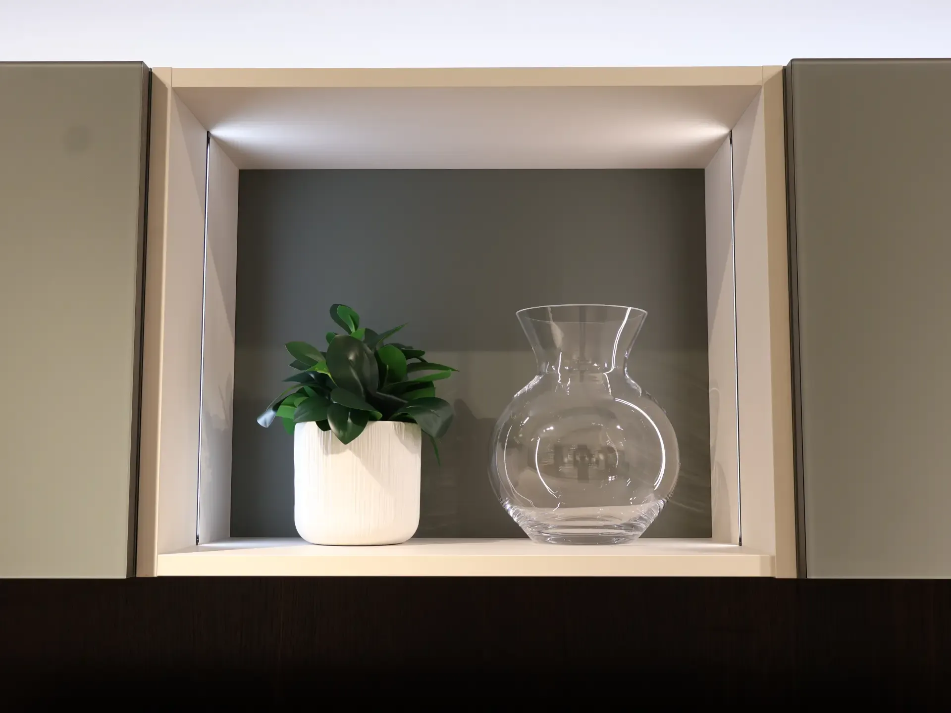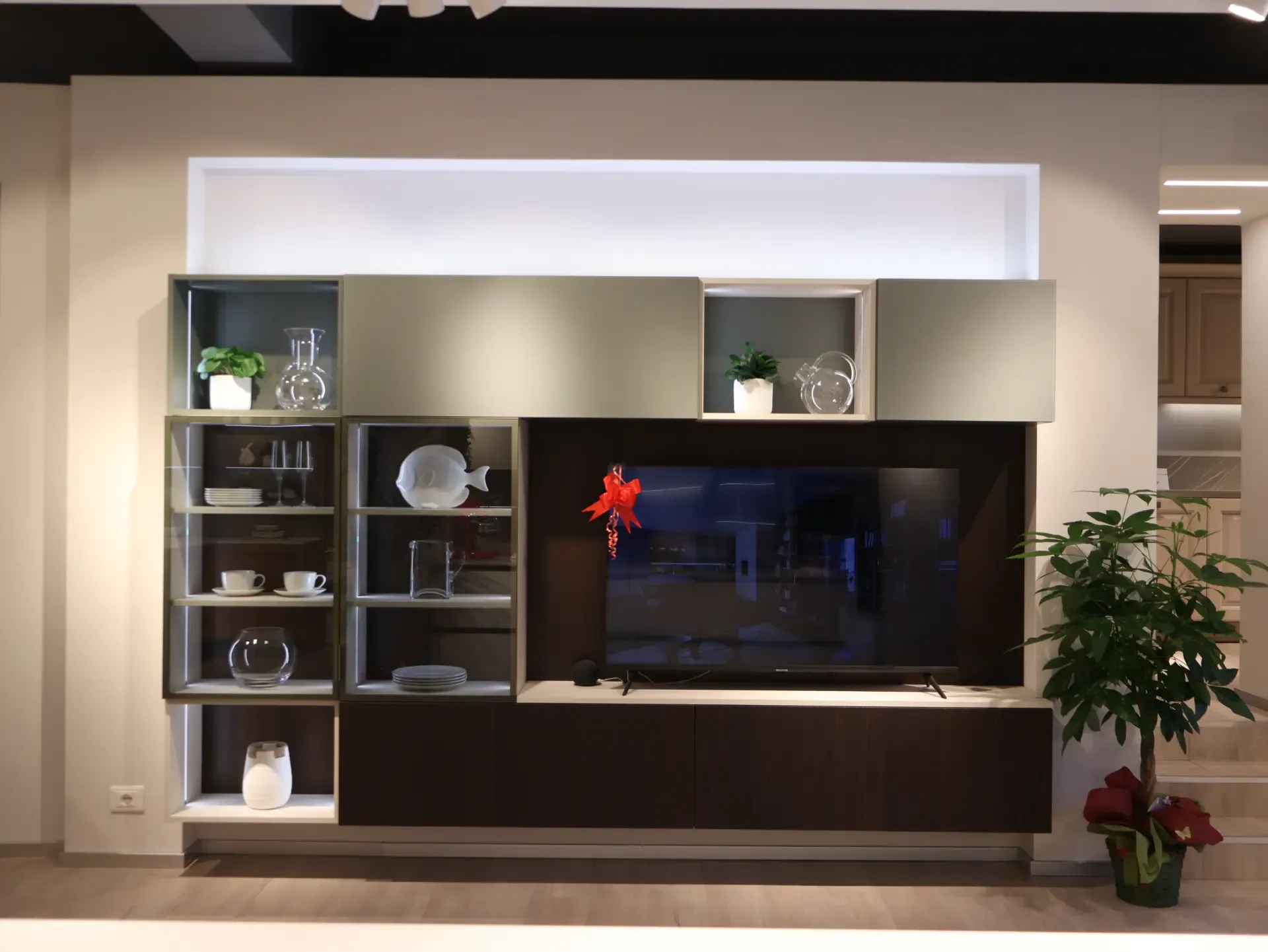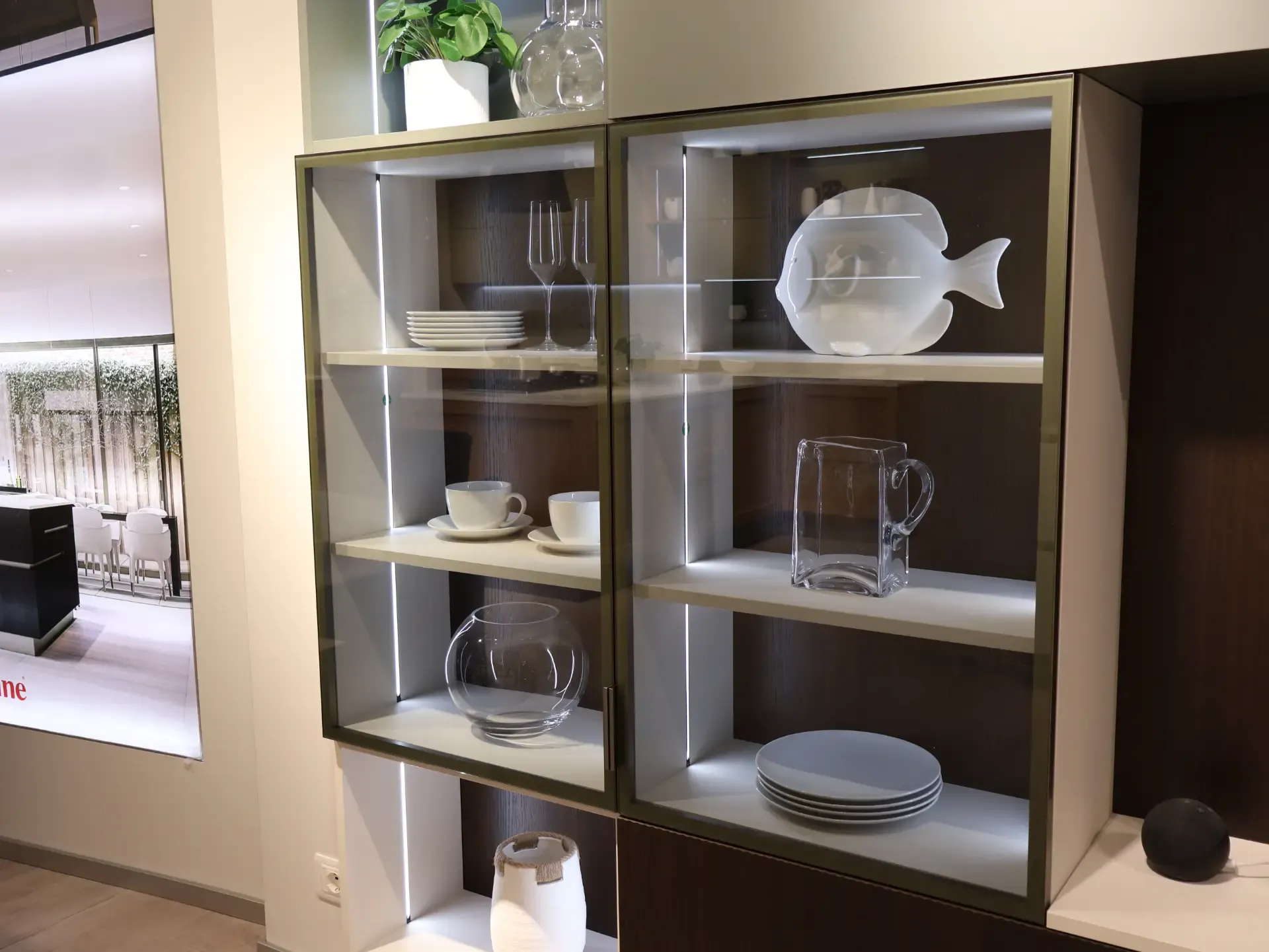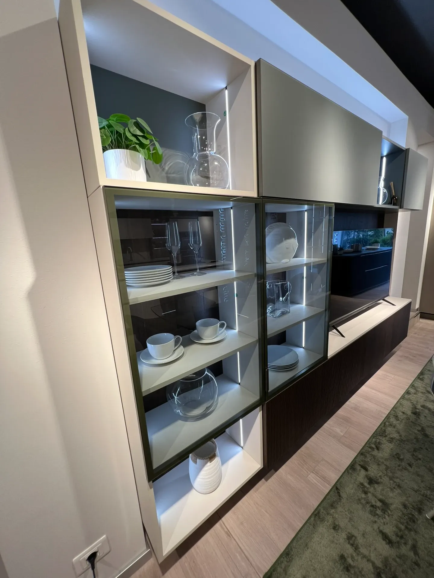 Le vetrine Sunset con illuminazione integrata valorizzano gli spazi espositivi e aggiungono luminosità all'ambiente. Una soluzione living funzionale e raffinata, perfetta per un soggiorno contemporaneo.