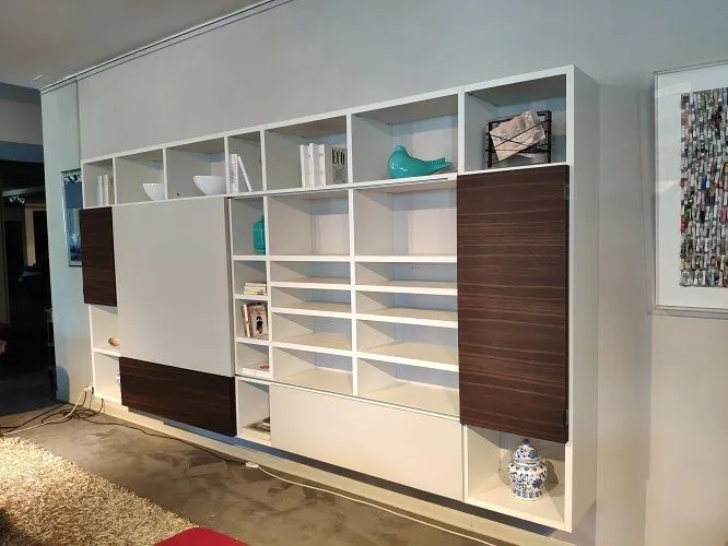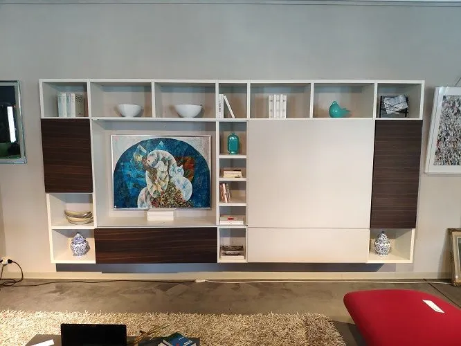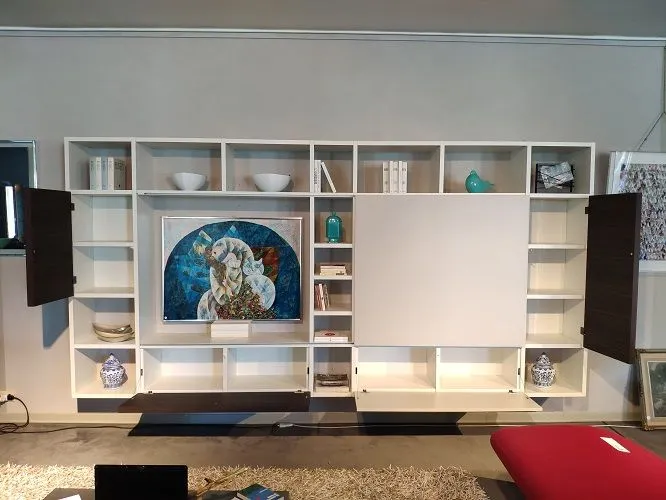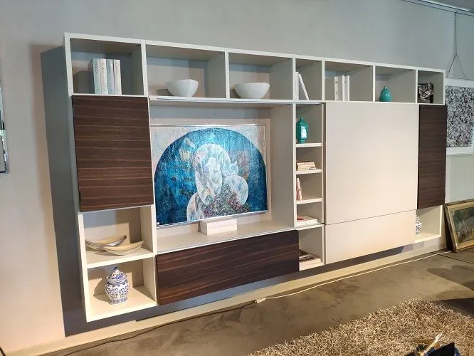 Parete soggiorno sospesa Selecta di Lema, struttura laccato Bianco, ante Tortora e Rovere Termocotto.