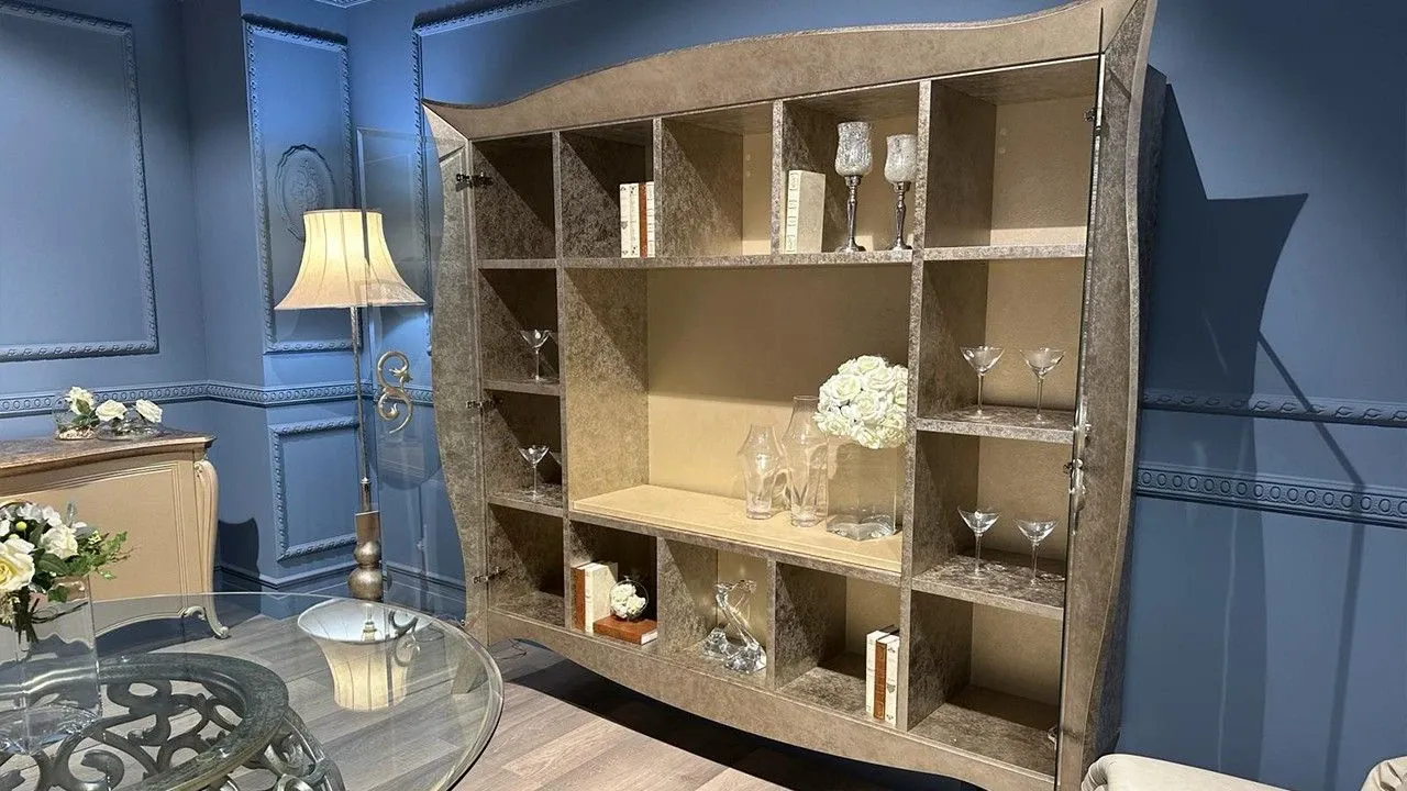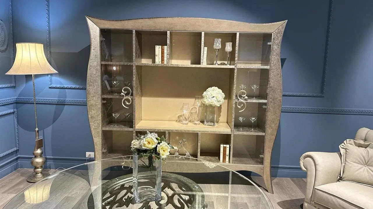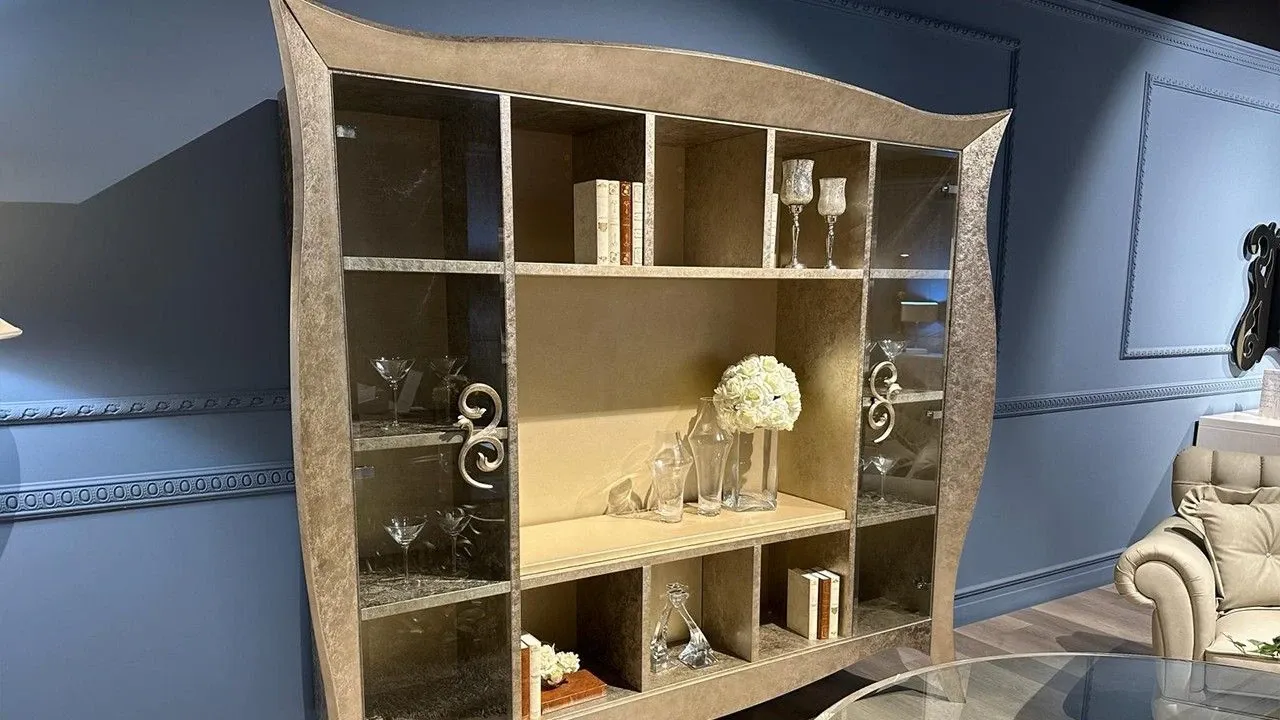 Disponibile all'interno dello Store di Cerignola (FG), parete libreria Liberty firmata Giusti Portos con ante vetro e maniglia Hera, tutta realizzata in finitura foglia oro tortora ed interno in laccato opaco nocciola dorato.