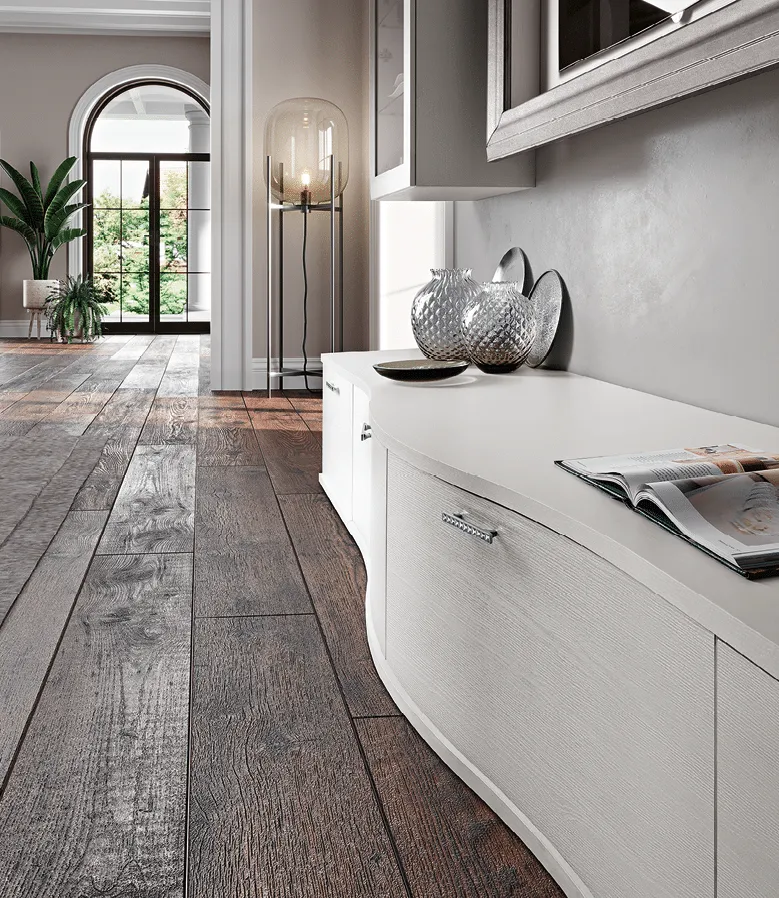 Il mobile soggiorno descritto è una soluzione completa e versatile per l'organizzazione dello spazio e l'esposizione di oggetti decorativi. Alla base, troviamo quattro cassettiere, di cui due leggermente più grandi rispetto alle altre due, offrendo così una varietà di spazio di archiviazione per adattarsi a diversi tipi di oggetti domestici. Queste cassettiere forniscono un'organizzazione efficiente per mantenere gli articoli ordinati e facilmente accessibili. Sopra le cassettiere, ci sono due vetrine laterali con mensole interne in vetro. Queste vetrine aggiungono un tocco di eleganza e offrono uno spazio espositivo ideale per esporre oggetti decorativi, collezioni o articoli di valore. I ripiani interni in vetro consentono una visibilità chiara degli oggetti esposti, permettendo loro di brillare attraverso le ante in vetro. Zona centrale con cornice di stile argentata porta tv. Mobile in finitura argento e bianco frassino come in foto. Personalizzazione delle finiture senza variazione di prezzo. Ha una lunghezza di 300cm, Altezza 195cm, Profondità 60cm. Consegna compresa nel prezzo, 30-40 giorni lavorativi. La nostra offerta per questo mobile living è di euro 2500,00. Per maggiori informazioni contattaci via mail o passa nel nostro showroom.