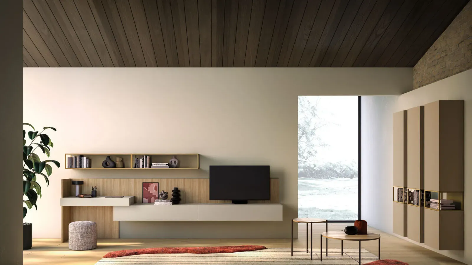 Una proposta multifunzionale che integra nella composizione uno scrittoio e una base sospesa che accoglie la TV. Calda e accogliente la resa cromatica di questa composizione, in perfetta sintonia con il suo ardito e informale abbinamento di linee e volumi.