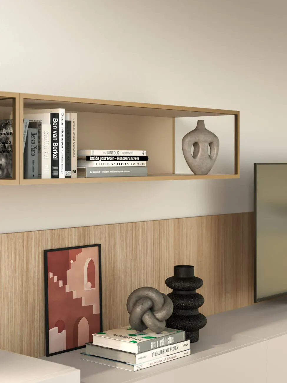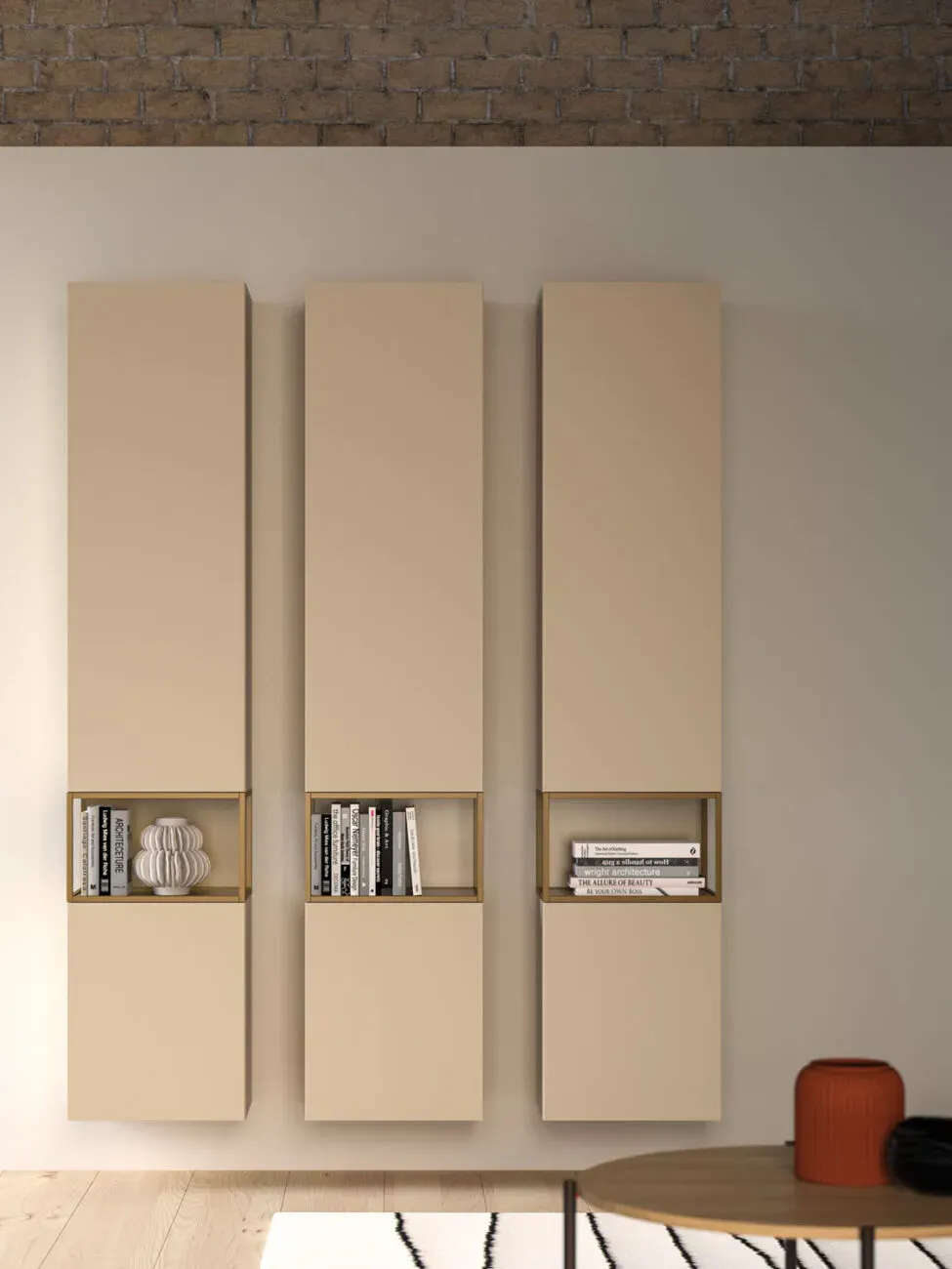 Pensile Modulo con cassetto in laccato opaco Sabbia e schienali in materico Rovere. Elementi Grafic in laccato metallizzato Cumino e laccato opaco Sabbia.