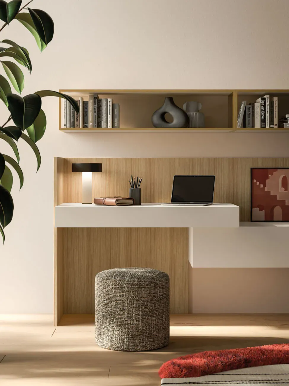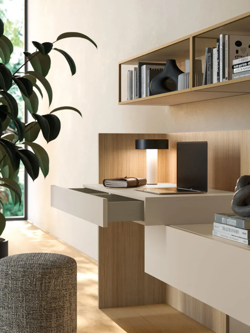 Basi sospese Modulo in laccato opaco Sabbia e schienali in materico Rovere.
