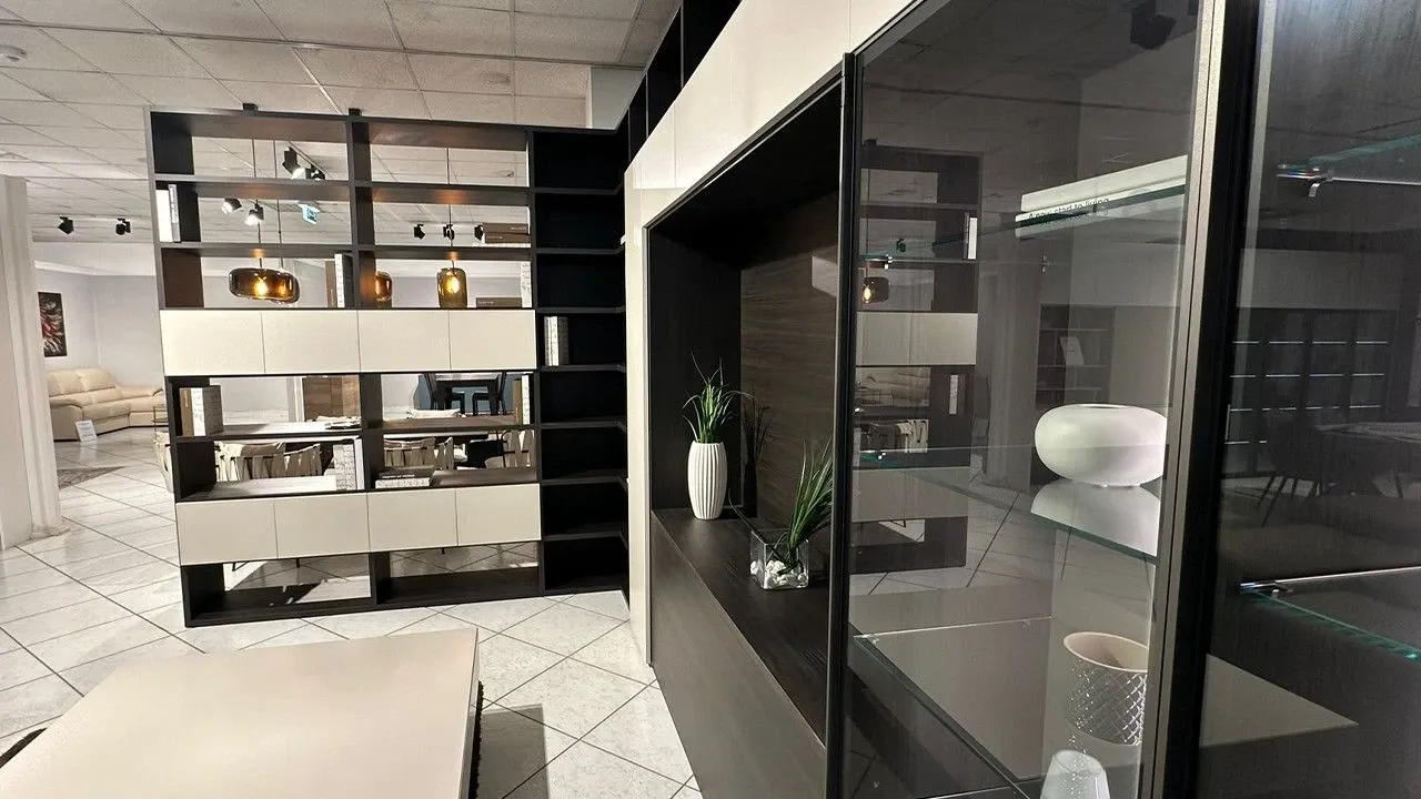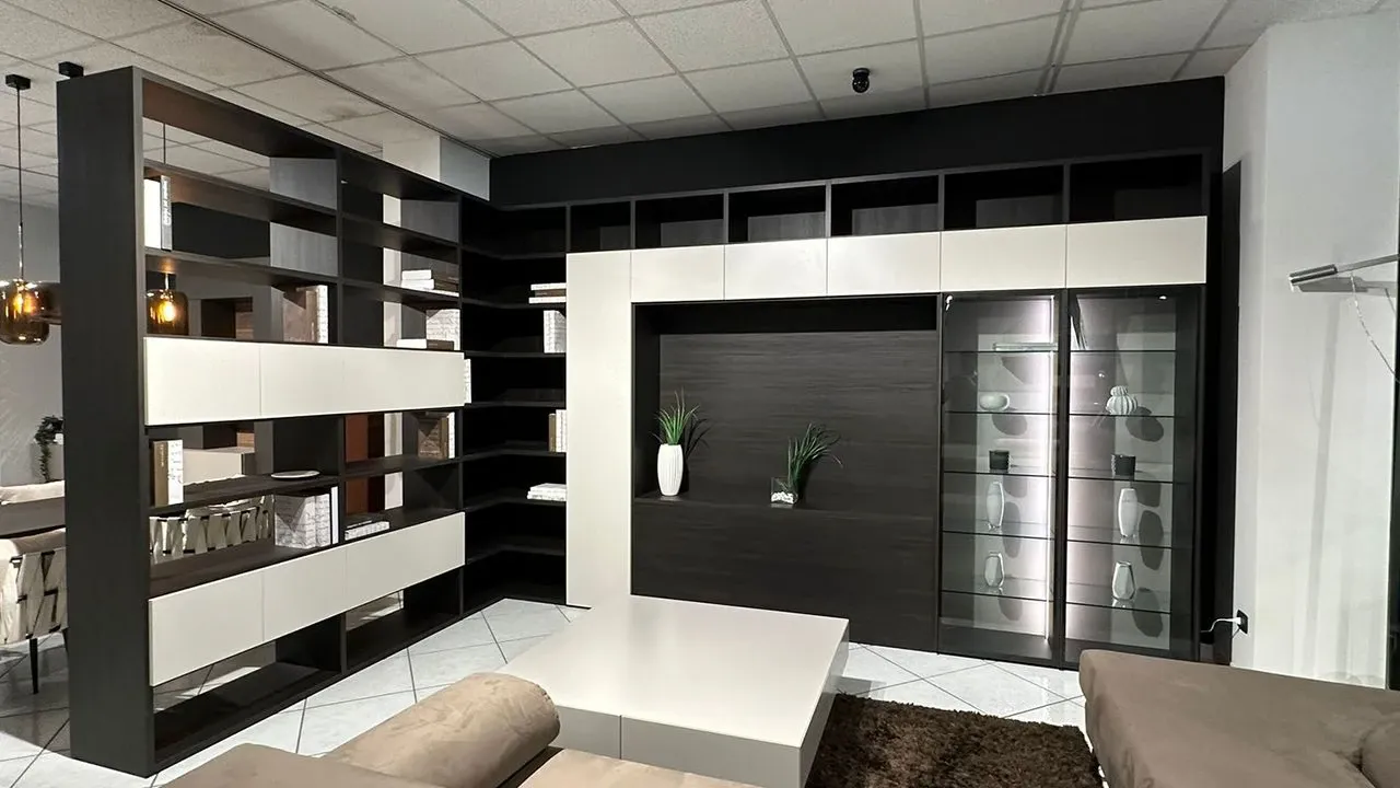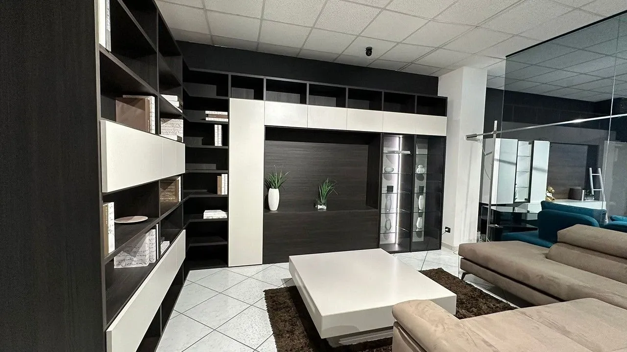 Per arricchire un living moderno scegli una parete attrezzata che mantenga una certa idea di stile, come questo modello Mood a prezzo ribassato.