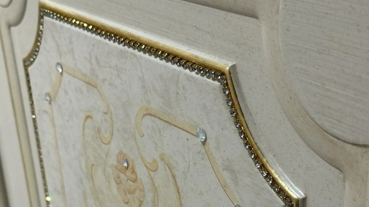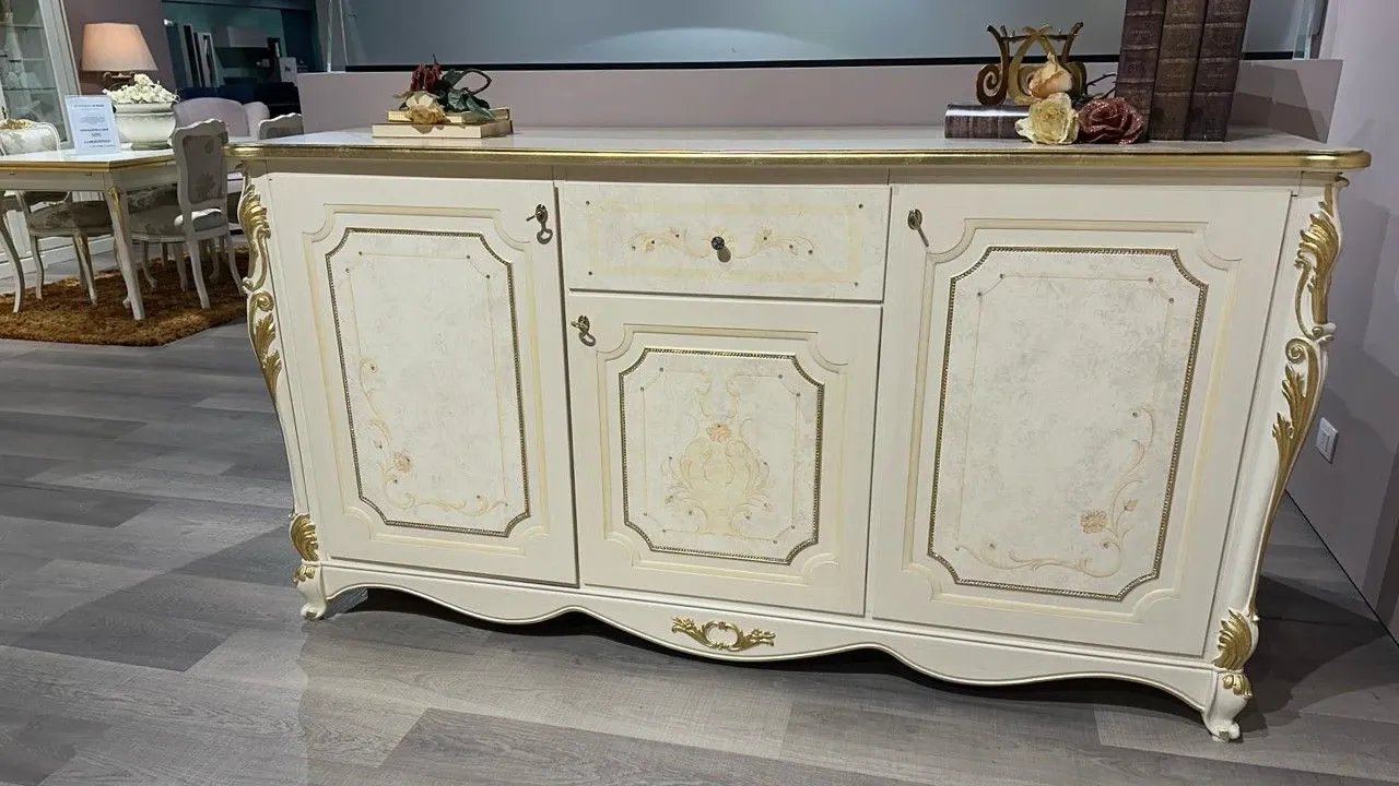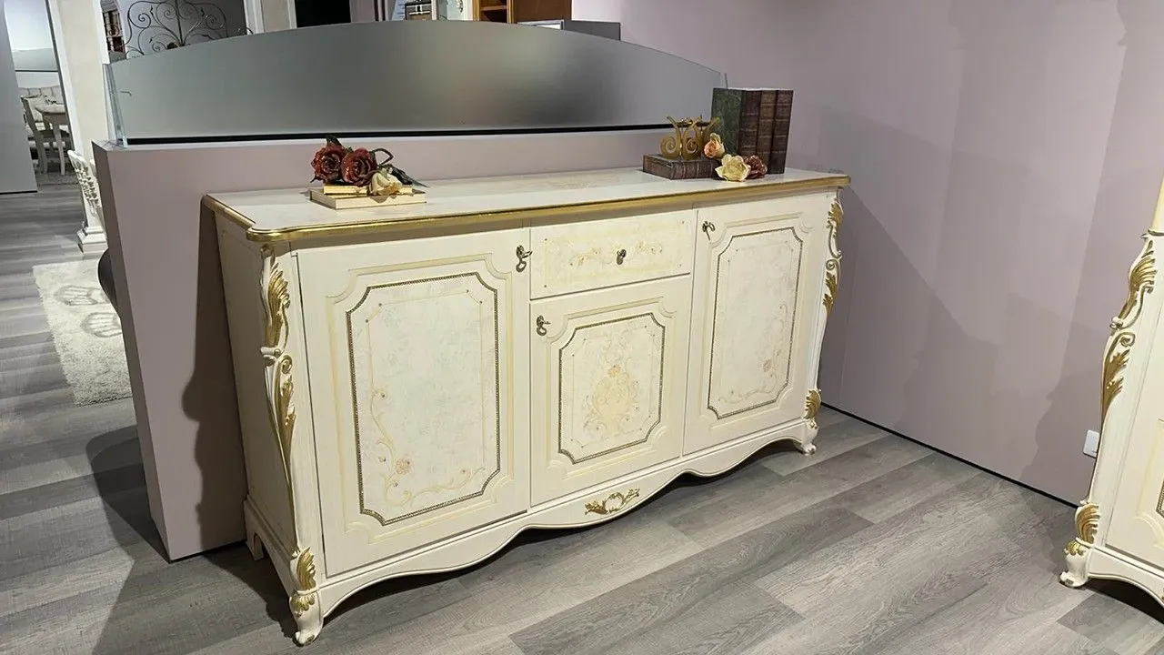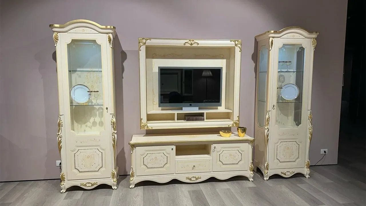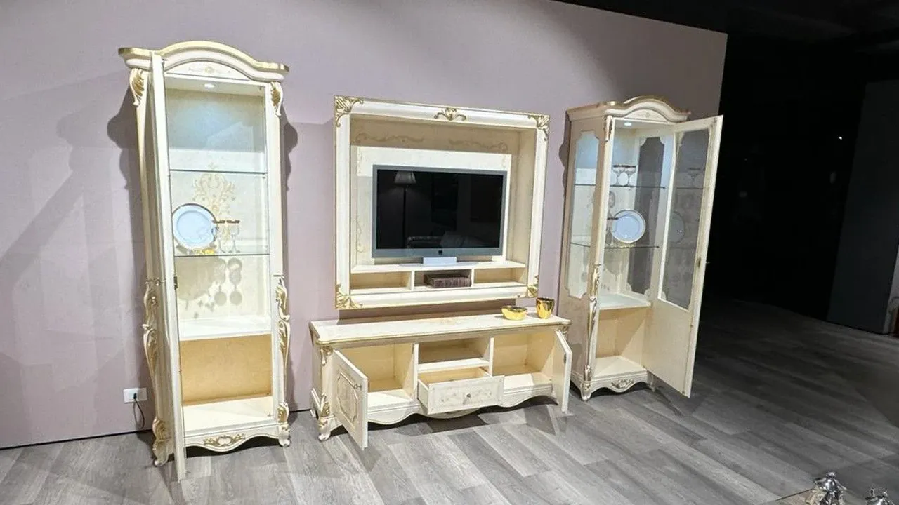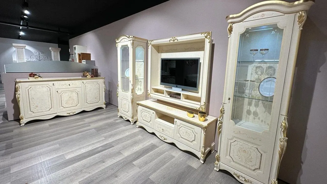 Sala classica patinata avorio con catenina swarovski con punti luce incastonati e decori realizzati a mano composta da vetrine laterali. Credenza bassa e porta Tv a muro.