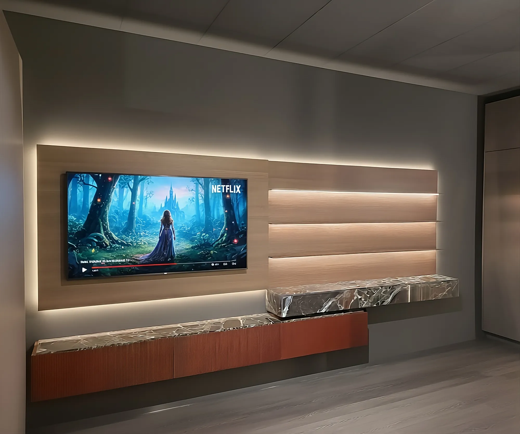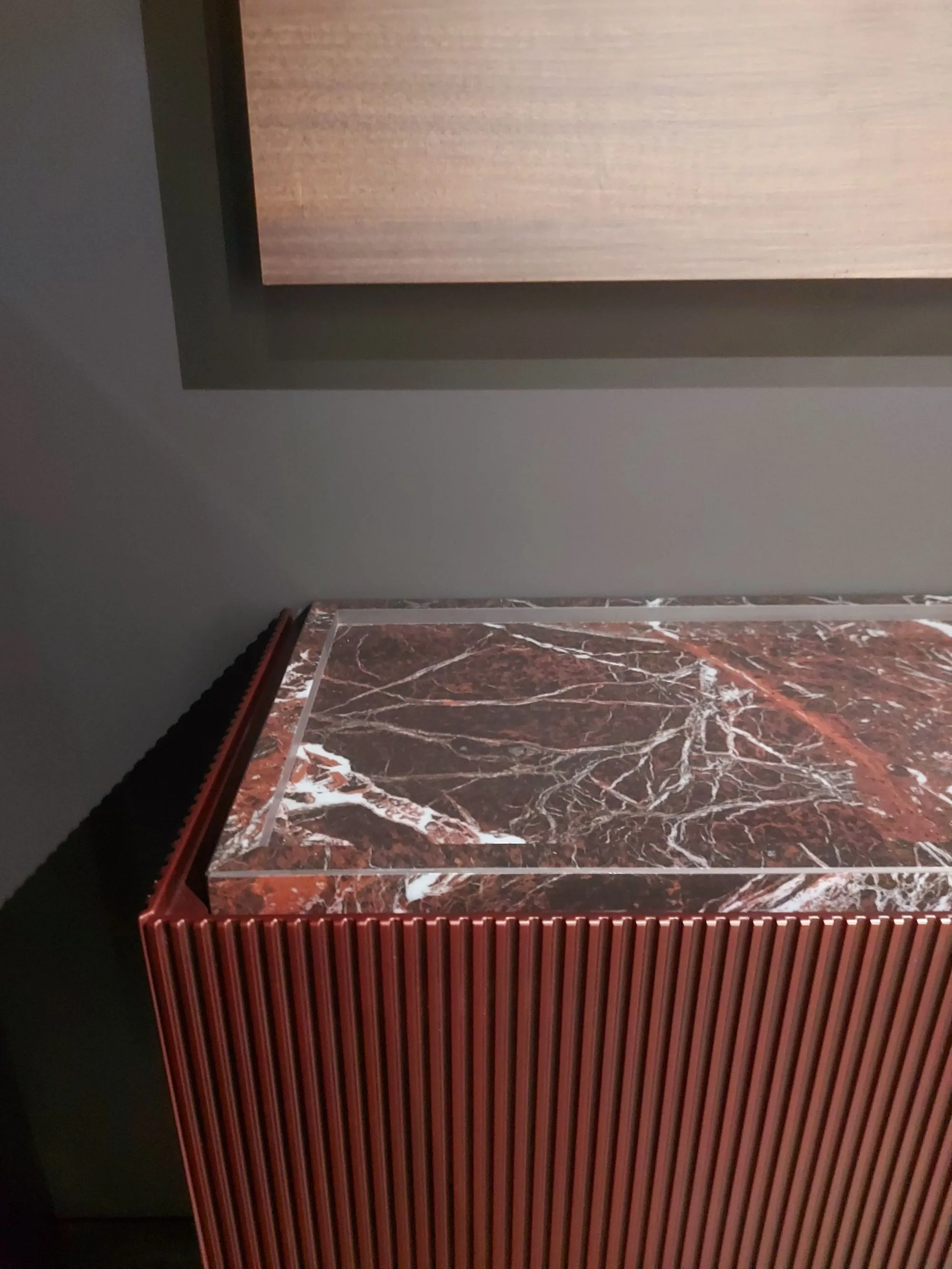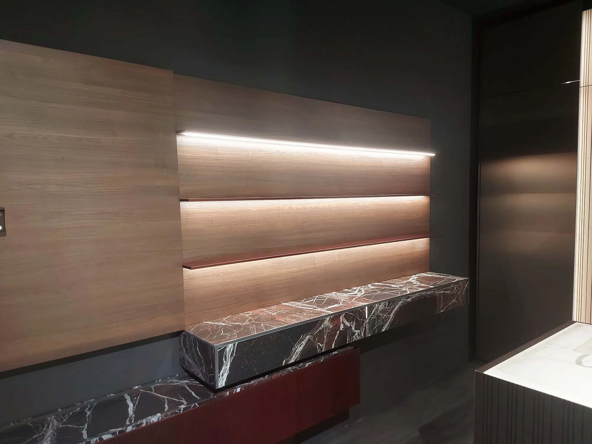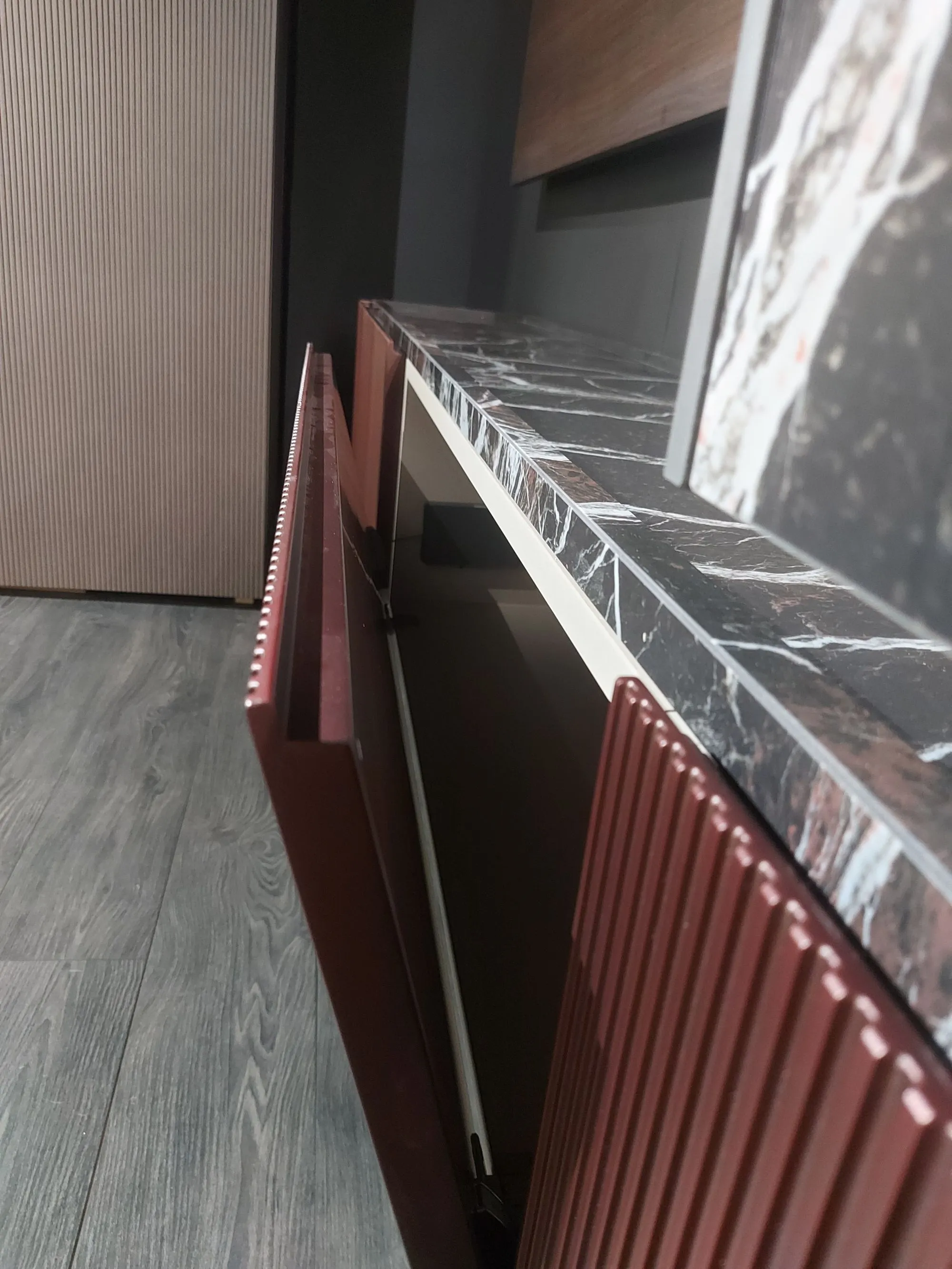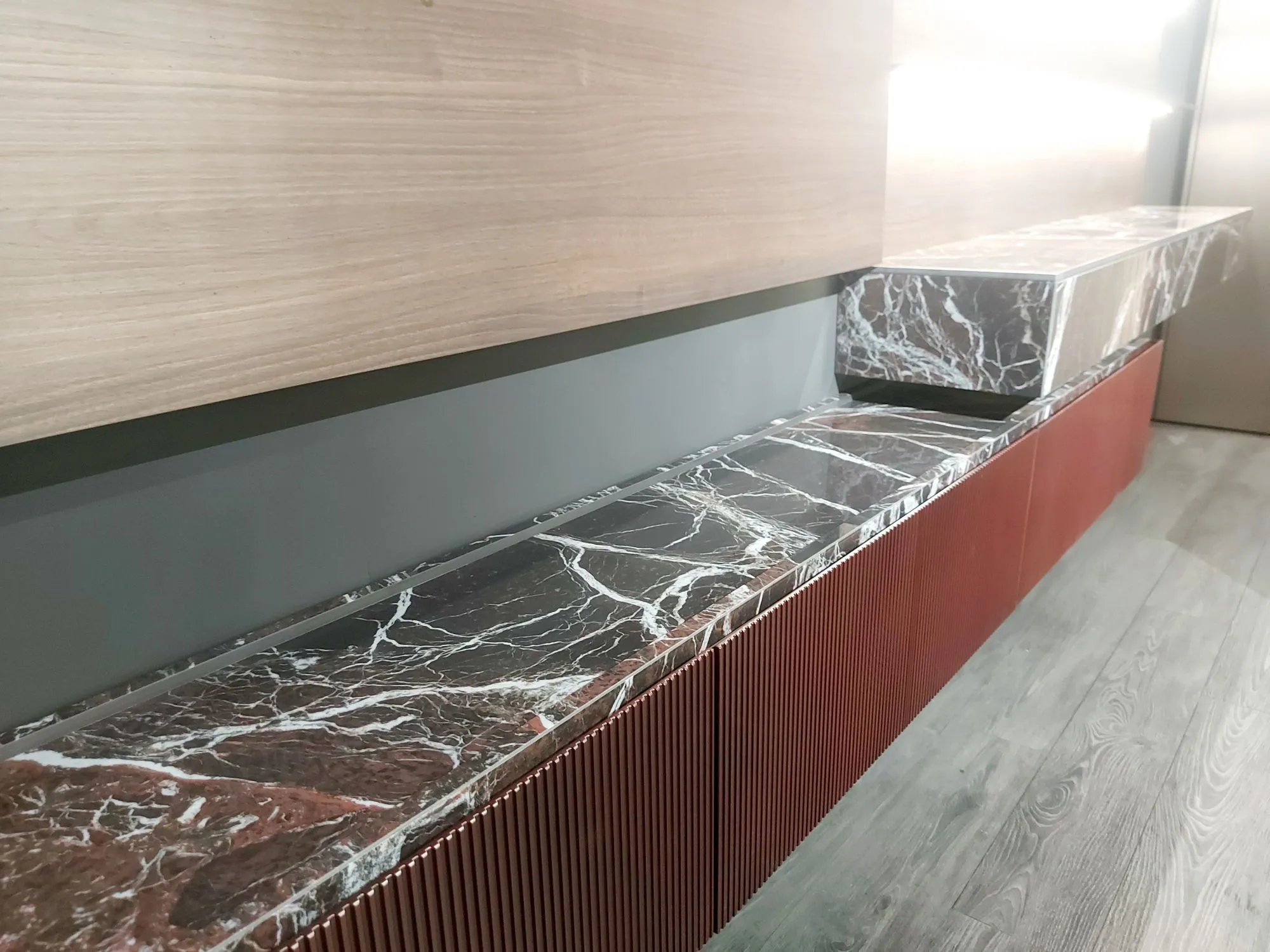 Parete Tv Living SOTTOCOSTO, in offerta per Rinnovo EXPO MOSTRA BINOVA ROMA PRENESTINA composta da boiserie in legno noce per TV (misura 180cm) + boiserie con mensole illuminate in colore in laccato Metallizzato Amaranto(misura 213cm). Nella parte inferiore è composta da base sospesa a 2 cassetti rivestita in pregiato gres ceramica Rosso Lepanto sia sul top che anche le ante sono in gres ceramico Si completa con altre 3 basi da 90cm cadauna in laccato Metallizzato colore Amaranto rigato cannettato con un top in gres ceramico Rosso Lepanto e salva goccia in rilievo. Parete Tv Attrezzata di assoluto pregio. Misura complessiva larghezza 393cm. NON SI EFFETTUA TRASPORTO E MONTAGGIO FUORI ROMA. Mobile visibile presso nostro store BINOVA .