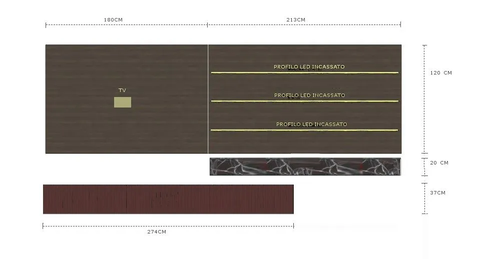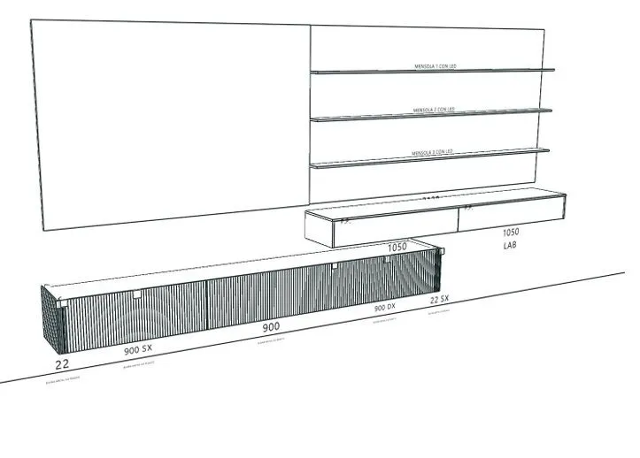 La larghezza della soluzione qui visibile, che va da 351 a 400 cm, è tale da rendere questo modello idoneo ad essere posizionato in locali di varie dimensioni.