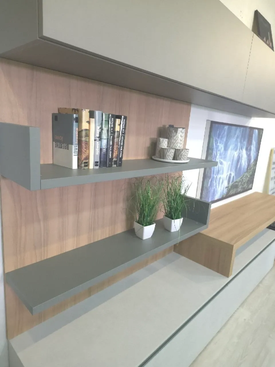 La boiserie con mensole a giorno aggiunge leggerezza visiva e spazio espositivo, mentre le chiusure rallentate e le maniglie a scomparsa con gola garantiscono comfort e pulizia formale.