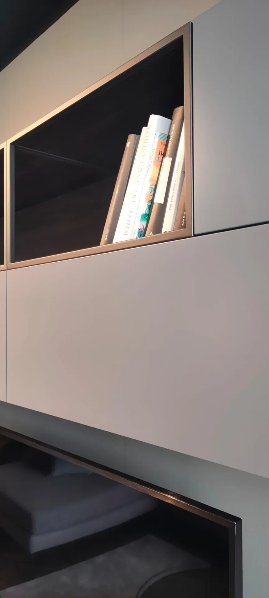 Questa parete attrezzata si distingue per linee essenziali, proporzioni equilibrate e un perfetto connubio tra funzionalità e stile contemporaneo.