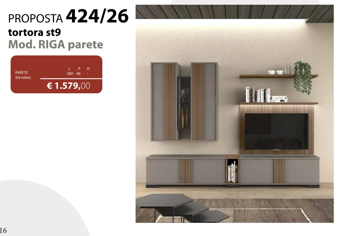 Per completare un soggiorno moderne opta per una parete attrezzata che mantenga una certa idea di stile, come questo modello Parete riga 424 a prezzo scontato.