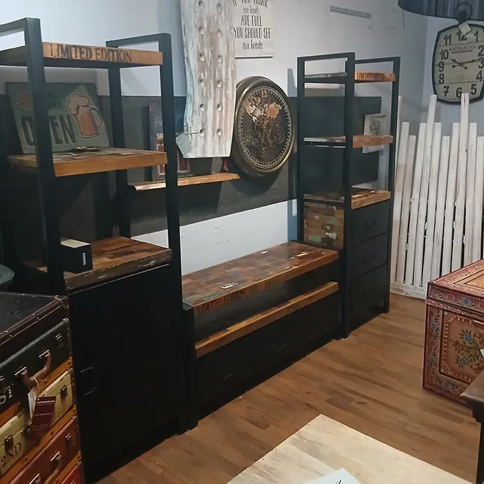 parete soggiorno industrial ferro e vero legno recicle india in mango