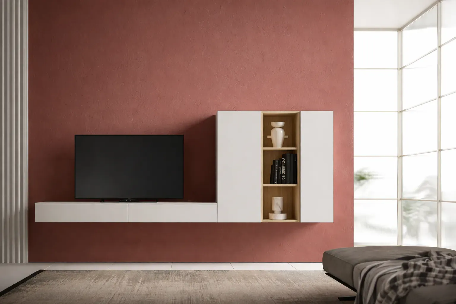La struttura è composta da un contenitore sospeso con 1 cassetto in legno, ideale per mantenere ordine e praticità, affiancato da un pensile vano giorno che offre uno spazio aperto perfetto per libri e oggetti decorativi. Completa la composizione un pensile 1 anta legno, che aggiunge capacità contenitiva mantenendo un estetica pulita. Il top del contenitore contribuisce a unificare visivamente l intera composizione, enfatizzando l orizzontalità.