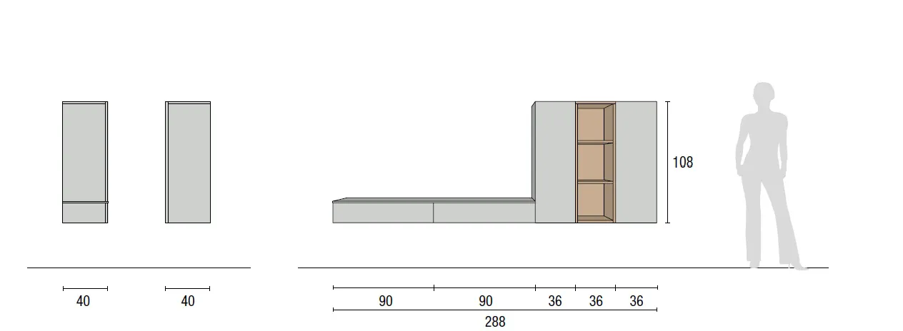 La composizione ha dimensioni complessive di L 288 cm, P 40 cm, H 144 cm ed è composta da:
