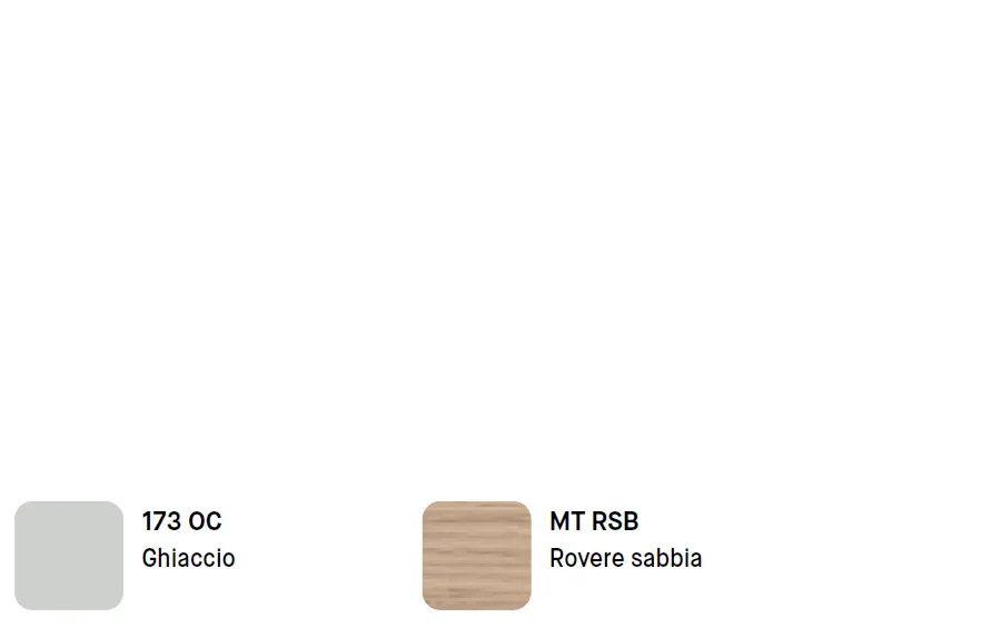 Le finiture esprimono uno stile sobrio e raffinato: il Ghiaccio dona luminosità e leggerezza all ambiente, mentre il Rovere Sabbia introduce una nota calda e naturale, creando un piacevole contrasto equilibrato.