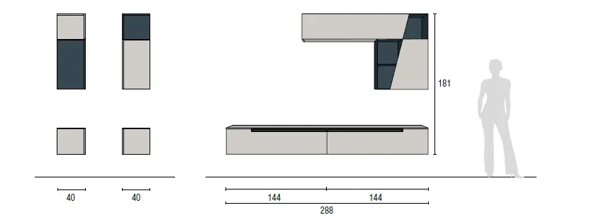La composizione ha dimensioni complessive di L 288 cm, P 40 cm, H 199 cm ed è composta da:
