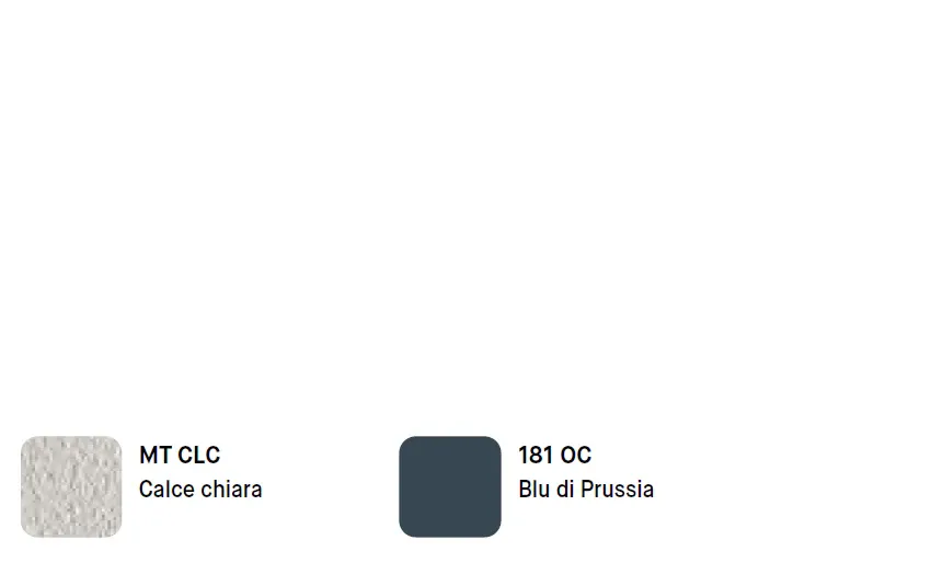 Le finiture esaltano il carattere contemporaneo: la Calce Chiara dona luminosità e matericità raffinata, mentre il Blu di Prussia introduce un contrasto deciso ed elegante, valorizzando le geometrie dei pensili e rendendo la composizione unica e distintiva.