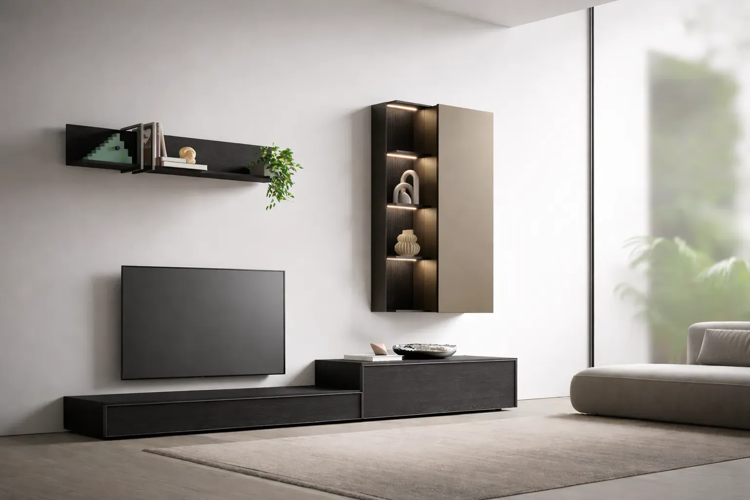 La base è composta da un contenitore a terra con 1 cassetto in legno affiancato da un contenitore a terra con 1 cestone in legno, offrendo ampia capacità contenitiva e praticità. La parte superiore è valorizzata da un pensile 1 anta in legno e da un elegante Totem Square sospeso, ideale per esporre oggetti grazie ai vani interni illuminati, che donano profondità e atmosfera all ambiente. La mensola Ring completa la composizione aggiungendo un elemento lineare e funzionale per libri e complementi.
