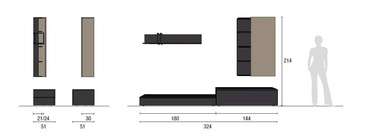 La composizione ha dimensioni complessive di L 324 cm, P 21/24/30/51 cm, H 214 cm ed è composta da: