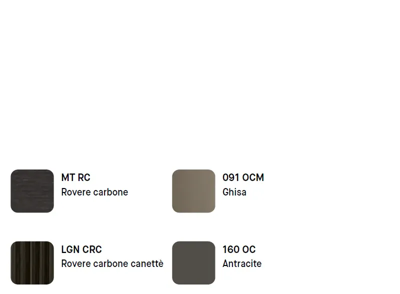 Le finiture esprimono un carattere deciso e contemporaneo: il Rovere Carbone, anche nella variante canette, dona profondità e texture sofisticata, mentre il Ghisa e l Antracite completano la palette con tonalità scure ed eleganti, perfette per ambienti moderni e raffinati.