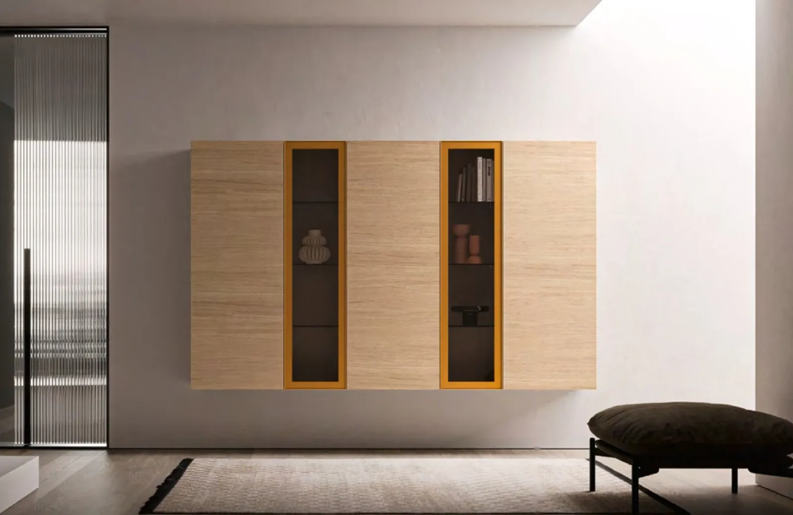 Parete soggiorno Tomasella dal design moderno ed elegante, proposta da Arredamenti Baraggia, ideale per arredare con stile ambienti contemporanei. La composizione è caratterizzata da pensili sospesi che alternano elementi con anta in legno e pensili con anta telaio vetrata, creando un raffinato gioco di volumi e trasparenze. Le vetrine, realizzate in vetro fumé, donano profondità e leggerezza visiva, perfette per esporre oggetti e complementi d arredo.