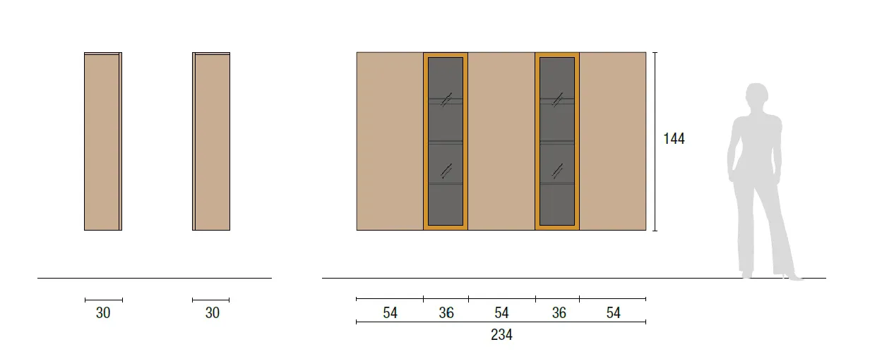 La composizione ha dimensioni complessive di L 234 cm, P 30 cm, H 180 cm ed è composta da moduli con profondità 30,4 cm e altezza 144 cm, suddivisi in elementi da 54 cm e 36 cm di larghezza. La soluzione sospesa rende l ambiente più arioso e facilita la pulizia, mantenendo un estetica pulita e ordinata.