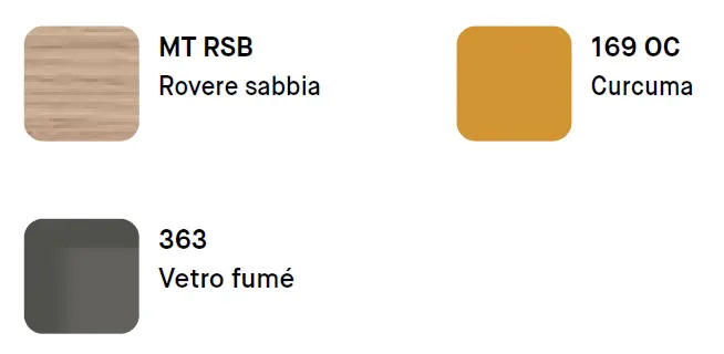 Le finiture valorizzano ulteriormente il design: la struttura in Rovere Sabbia, dal tono naturale e caldo, si abbina ai dettagli Curcuma delle ante telaio, creando un piacevole contrasto contemporaneo e ricercato. Il risultato è una parete attrezzata equilibrata, moderna e di grande impatto estetico.