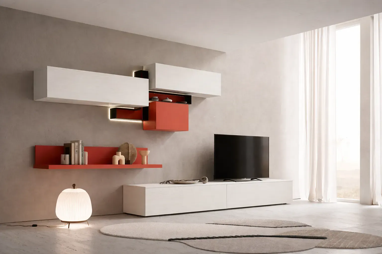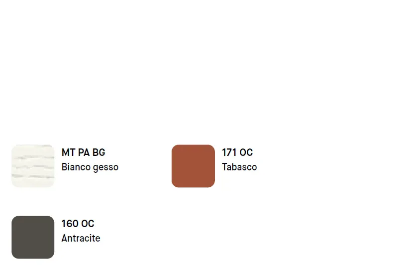 Le finiture sono il vero punto di forza della composizione: il luminoso Bianco gesso crea una base neutra ed elegante, mentre il deciso Tabasco introduce una nota cromatica vivace e contemporanea. Il contrasto con l Antracite dona profondità e carattere, rendendo l insieme equilibrato e di forte impatto visivo.