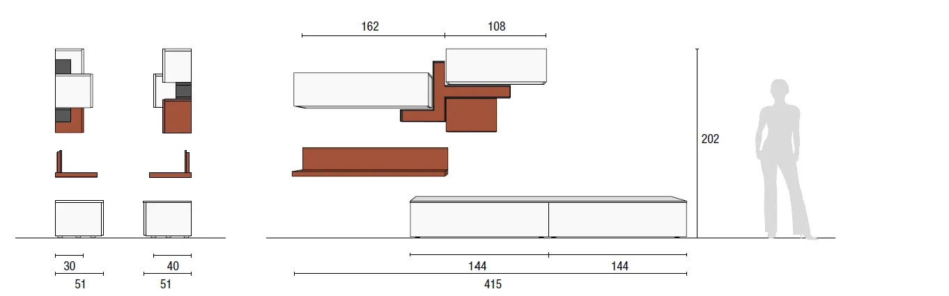 Le dimensioni complessive della composizione sono L 415 cm, P 30/40/45/51 cm, H 202 cm, con elementi così distribuiti: