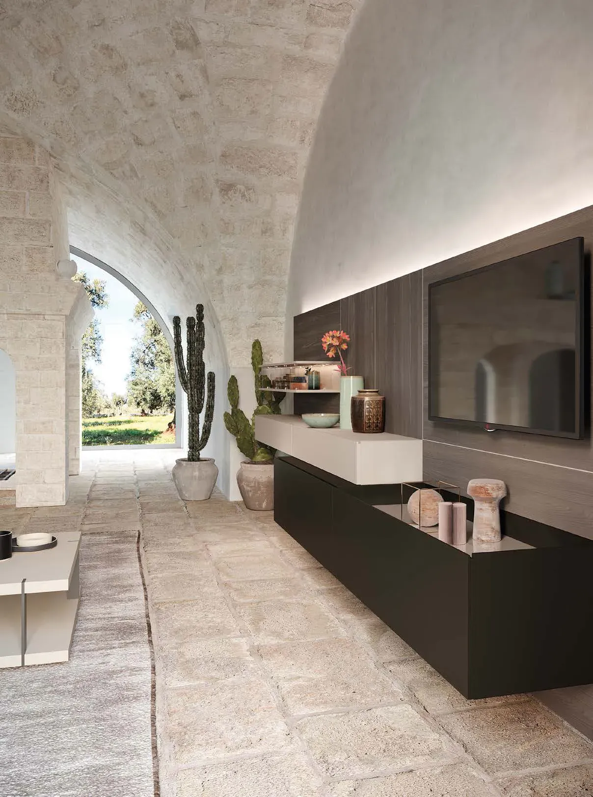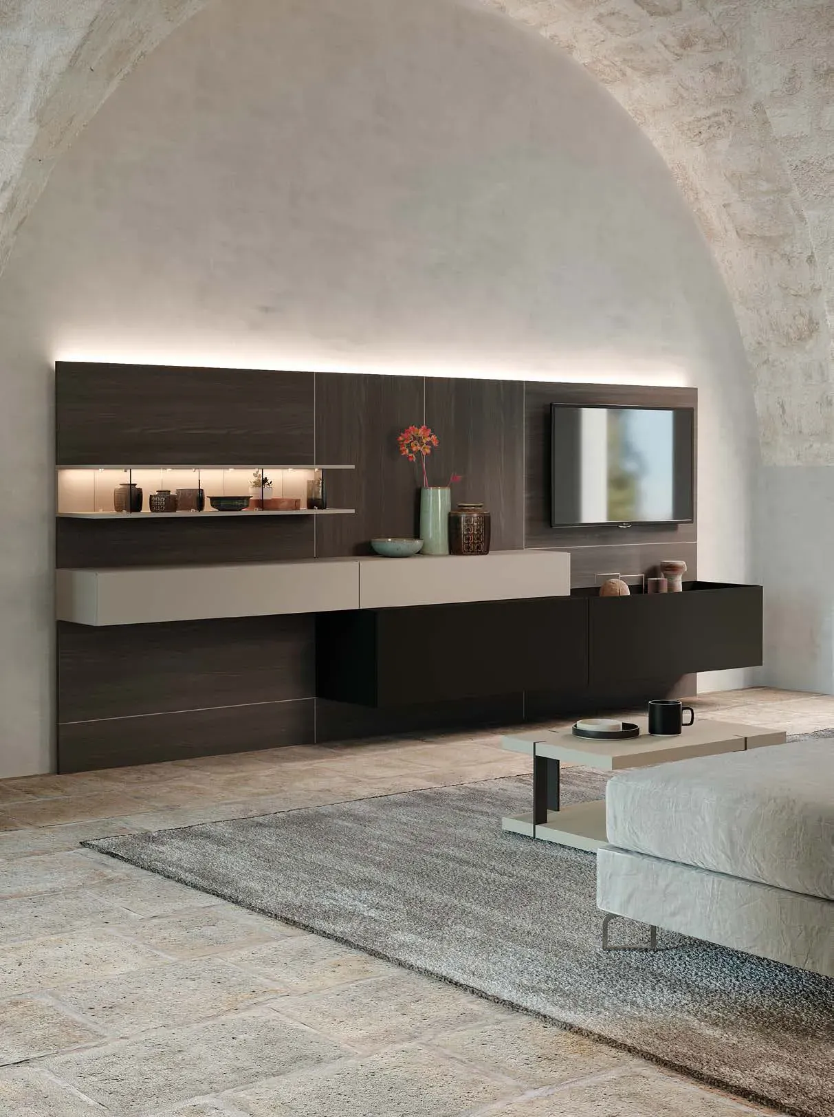 Forme decise e un design unico contraddistinguono questa composizione per la zona giorno, rendendola ideale per impreziosire uno spazio in stile design.