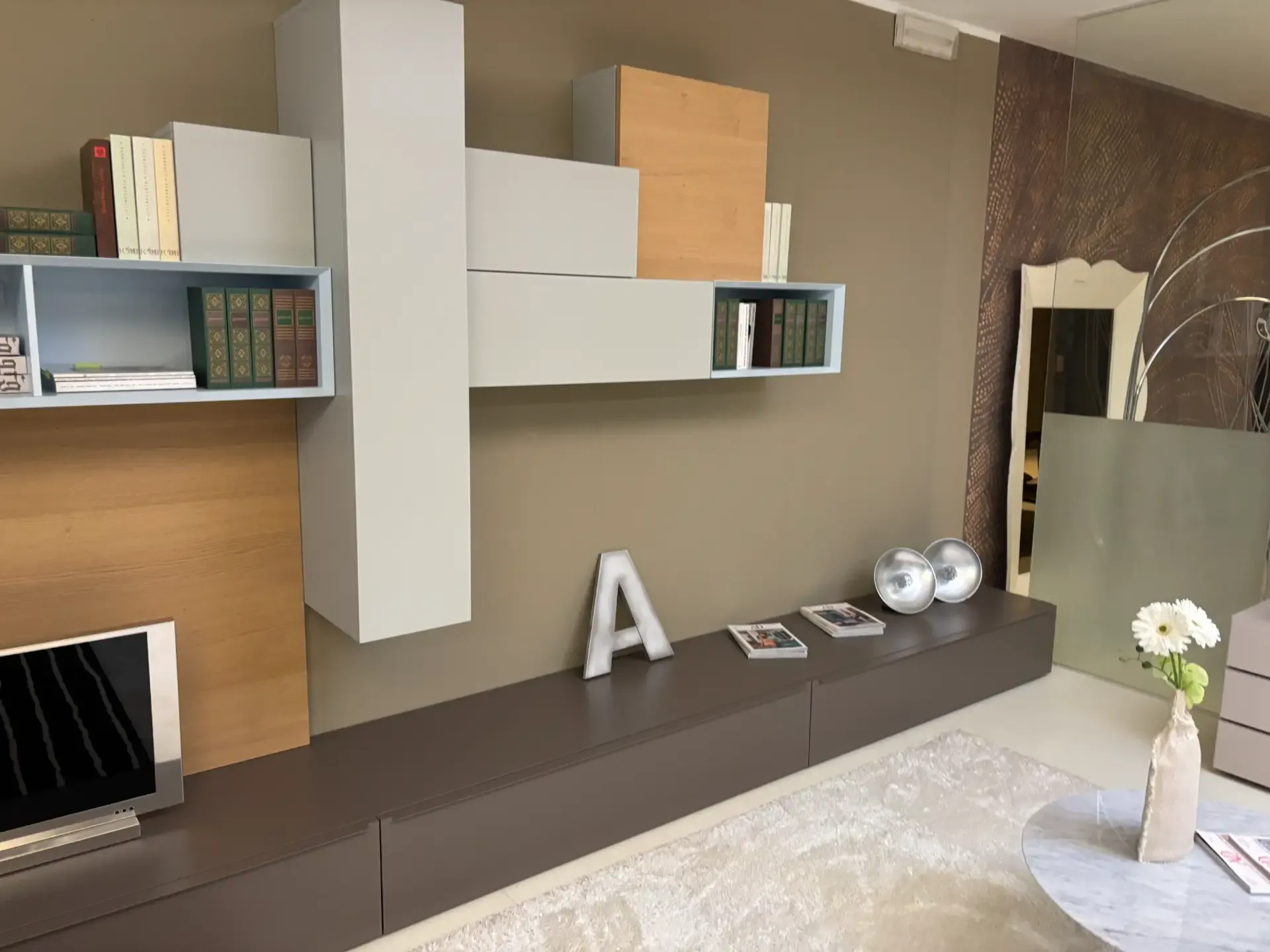 Per valorizzare un soggiorno moderne scegli una parete attrezzata che mantenga una certa linea stilistica, come questo modello Spezio a prezzo ribassato.