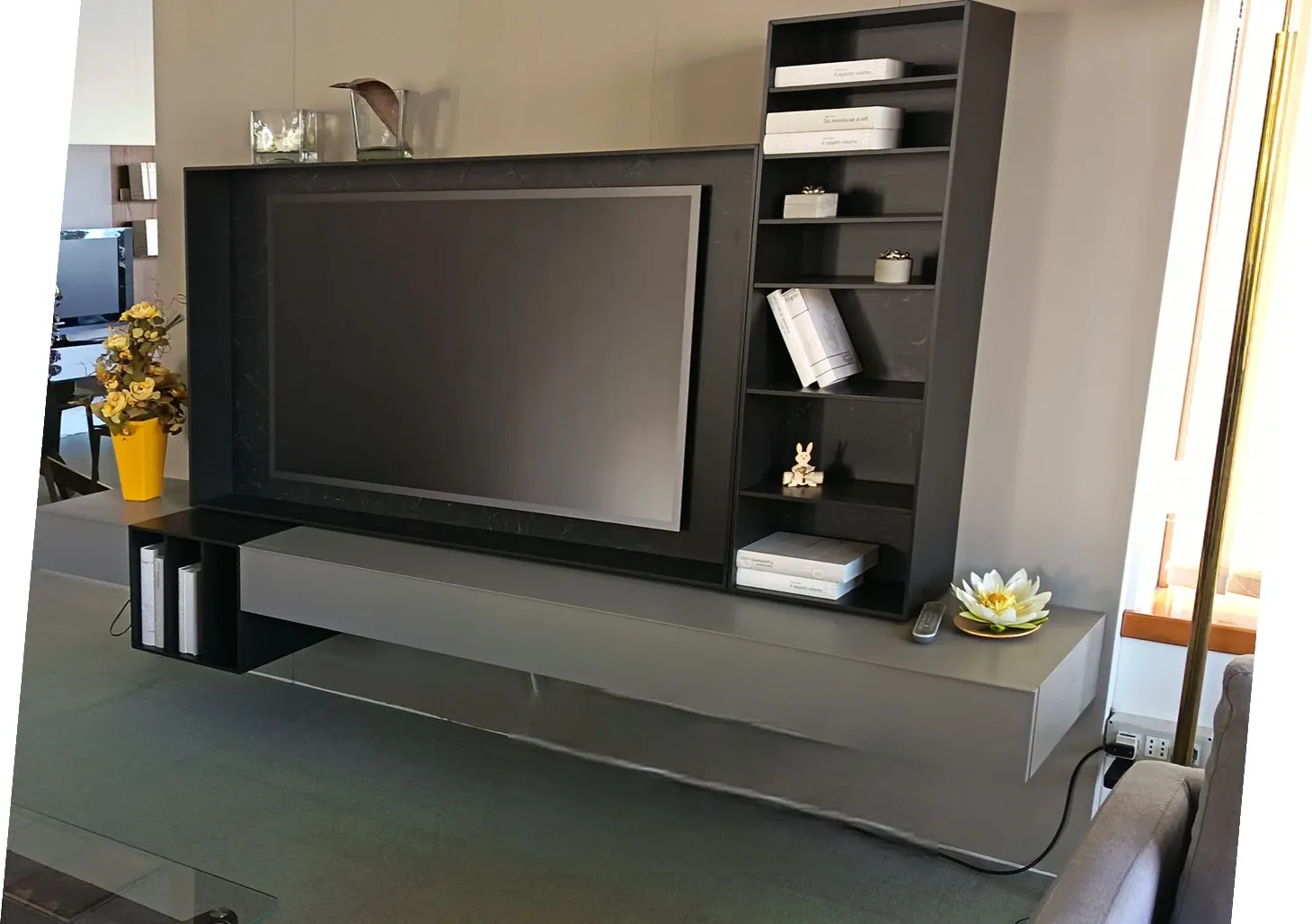 MOBILE A PARETE SOSPESO WALLOVER DI CACCARO CON CORNICE TV E LIBRERIE LUMINOSE