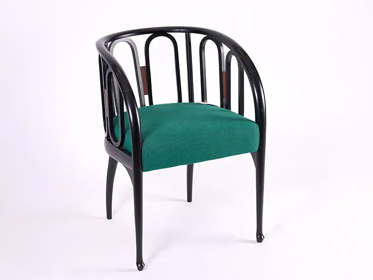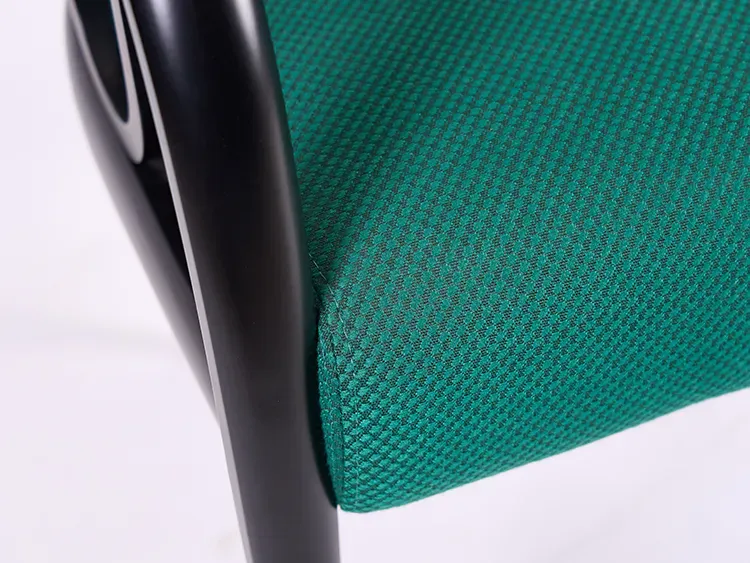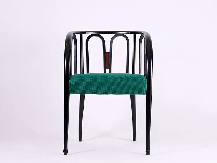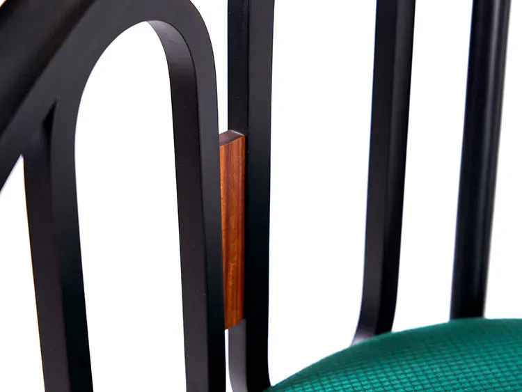 Ha una struttura in nero opaco e seduta rivestita in tessuto verde. Il design minimale esalta l'eleganza dei materiali scelti.