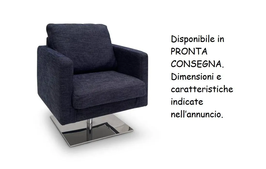 Poltroncina con BASE GIREVOLE in PRONTA CONSEGNA realizzata con il tessuto indicato, completamente SFODERABILE. Le dimensioni sono: larghezza cm 78, profondità cm 68, altezza cm 86. STRUTTURA Struttura portante a pannelli di agglomerato di legno da 18 mm a bassa emissione di formaldeide (classe E1), con parti in legno massello di abete e/o pioppo e pannelli di fibre di legno compresse a caldo. Il tutto assemblato con colla vinilica a base di acqua e ferramenta di fi ssaggio, poi rivestito con vellutino 100% poliammide termoaccoppiato a poliuretano espanso. MOLLEGGIO Realizzato mediante nastri elastici da mm 80 tesi meccanicamente, composti da fili di gomma rivestiti da fi lo di nylon avvolto a spirale. IMBOTTITURA Cuscino seduta in espanso indeformabile densità 30. Cuscino schienale in espanso densità 18. Entrambi i cuscini sono rivestiti con ovatta di fi bra poliestere da 300 g termolegata. PIEDINI Piede/struttura in tubo di metallo cromato.