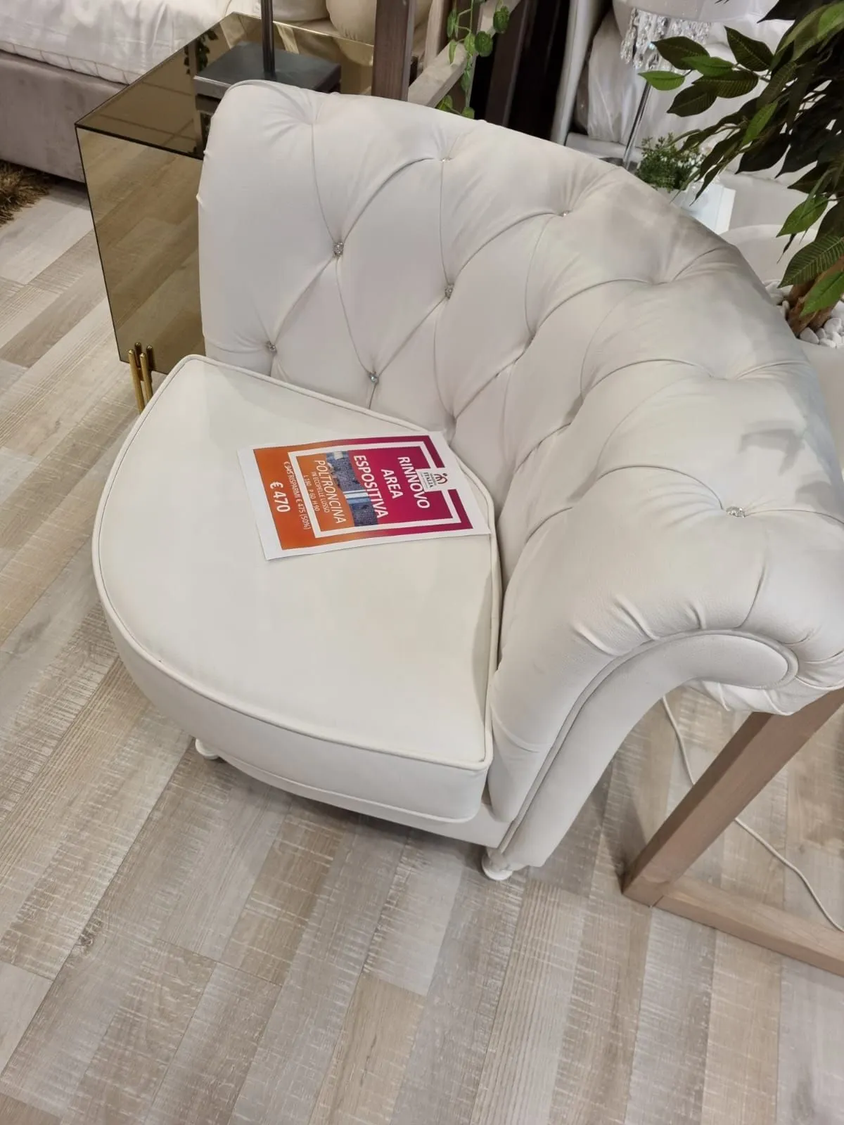 Nel soggiorno o nelle altre zone di casa le poltroncine sono accessori importanti che connotano lo stile dell'ambiente e svolgono un ruolo fondamentale. La proposta Swarovsky nella fotografia fa parte della nostra serie di imbottiti in Ecopelle a marchio Artigianale: grazie a quest'offerta potrai avere una tra le più belle soluzioni d'arredo a prezzo scontato.