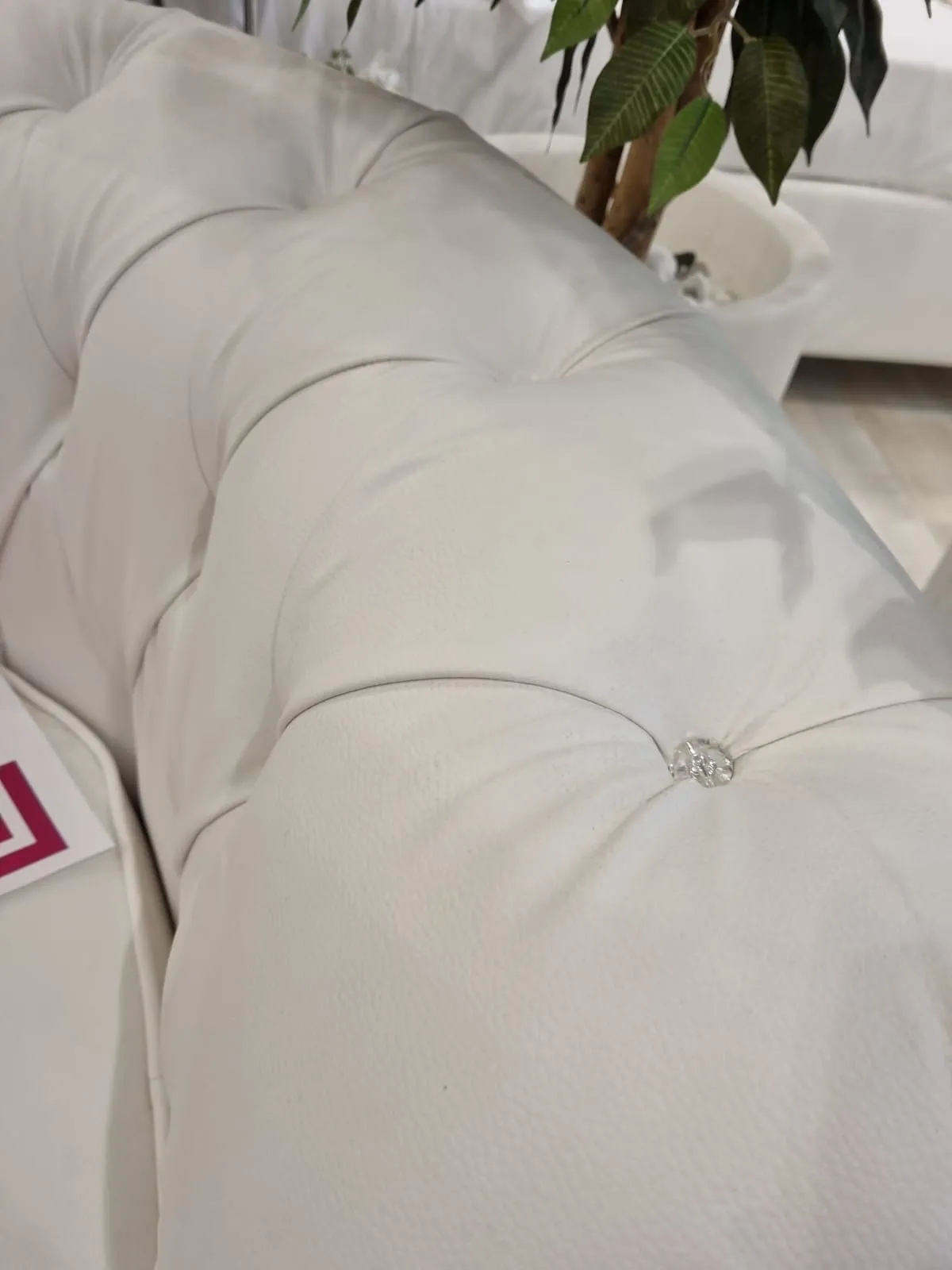 La poltroncina è rivestita in ecopelle lusso bianca con dettagli Swarovsky e effetto capitonné artigianale. L'ecopelle garantisce durabilità e facilità di pulizia mantenendo un aspetto elegante.