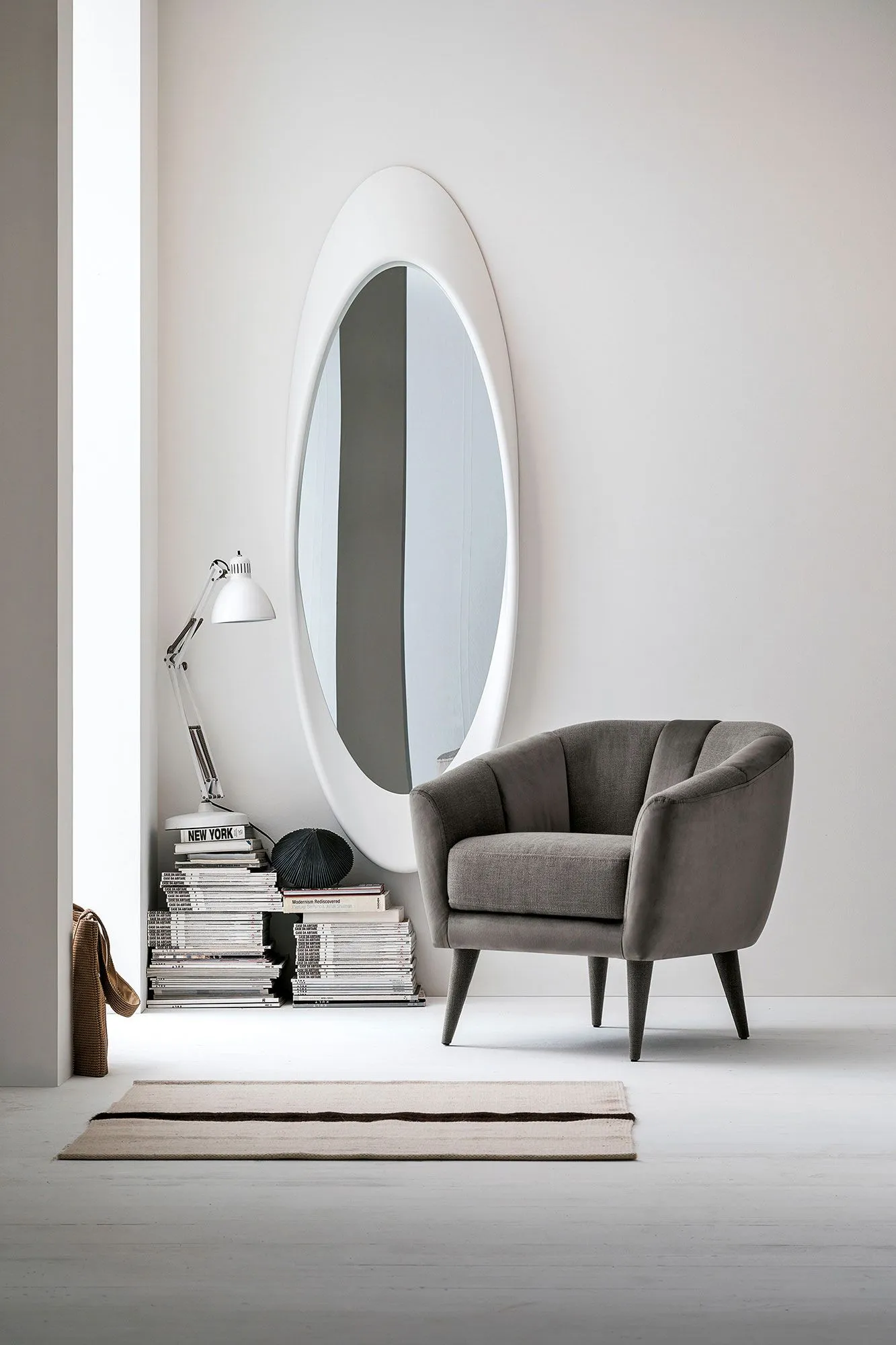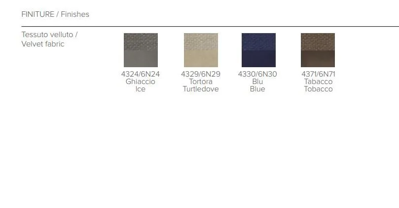 Poltroncina realizzata con la combinazione di morbido tessuto e microfibra effetto velluto tono su tono, a scelta il rivestimento in 3 colorazioni.