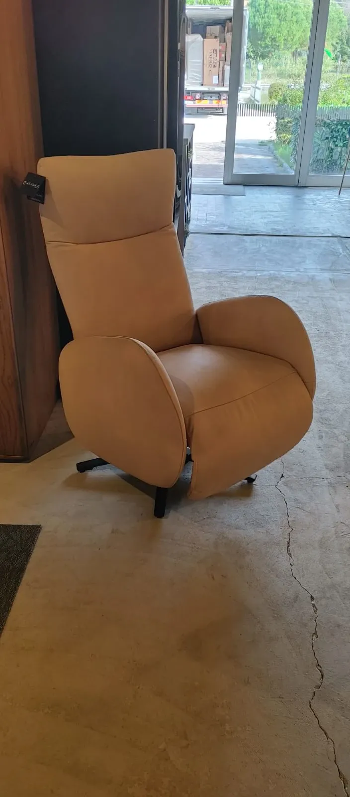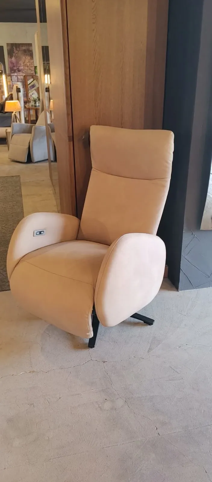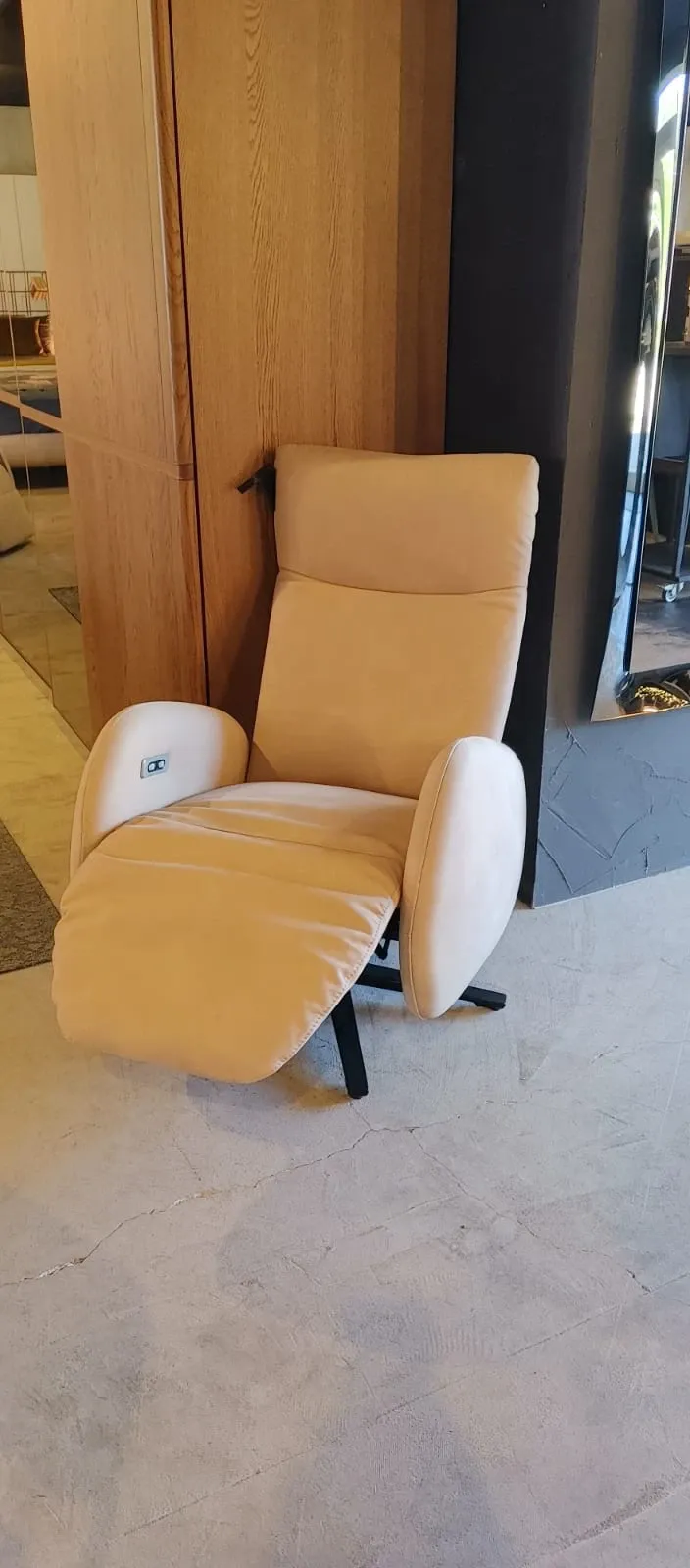 Moderna poltrona relax con batteria estraibile ricaricabile. Poggiatesta reclinabile manualmente. Basamento girevole nero. Rivestimento in pelle beige.