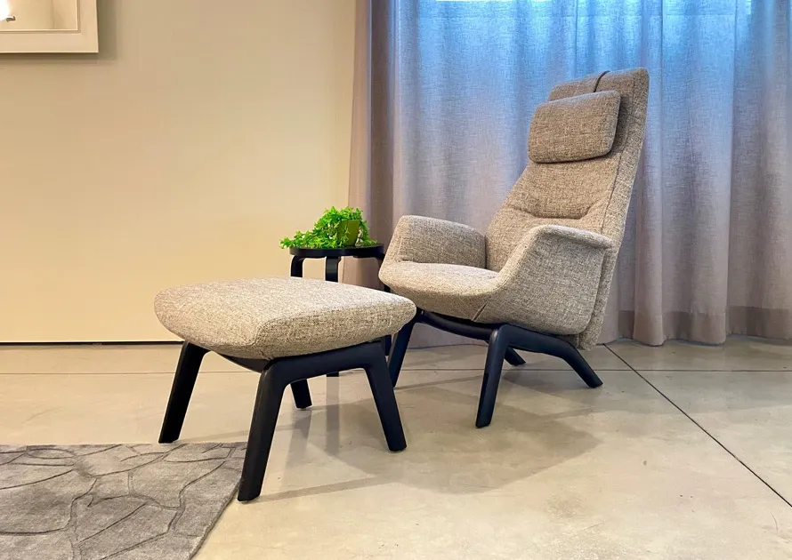 Poltrona Frau mod. Downtown Lounge con pouf, base in frassino tinto wengè, rivestimento in tessuto Solstice Peppercorn. Prodotto nuovo da esposizione. Dim: l.71 p.89 h.41,5/104 (poltrona) - l.59 p.48,5 h.40 (pouf)