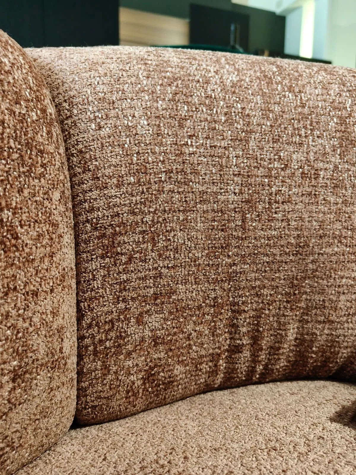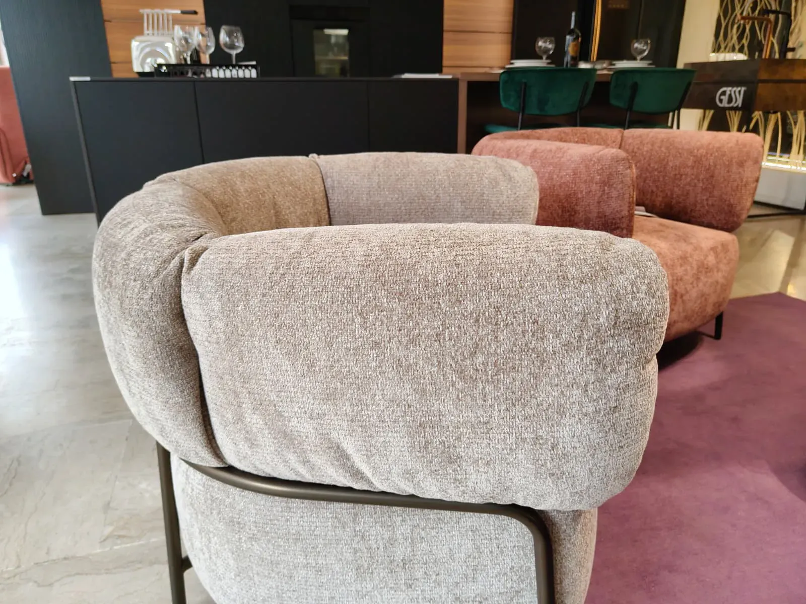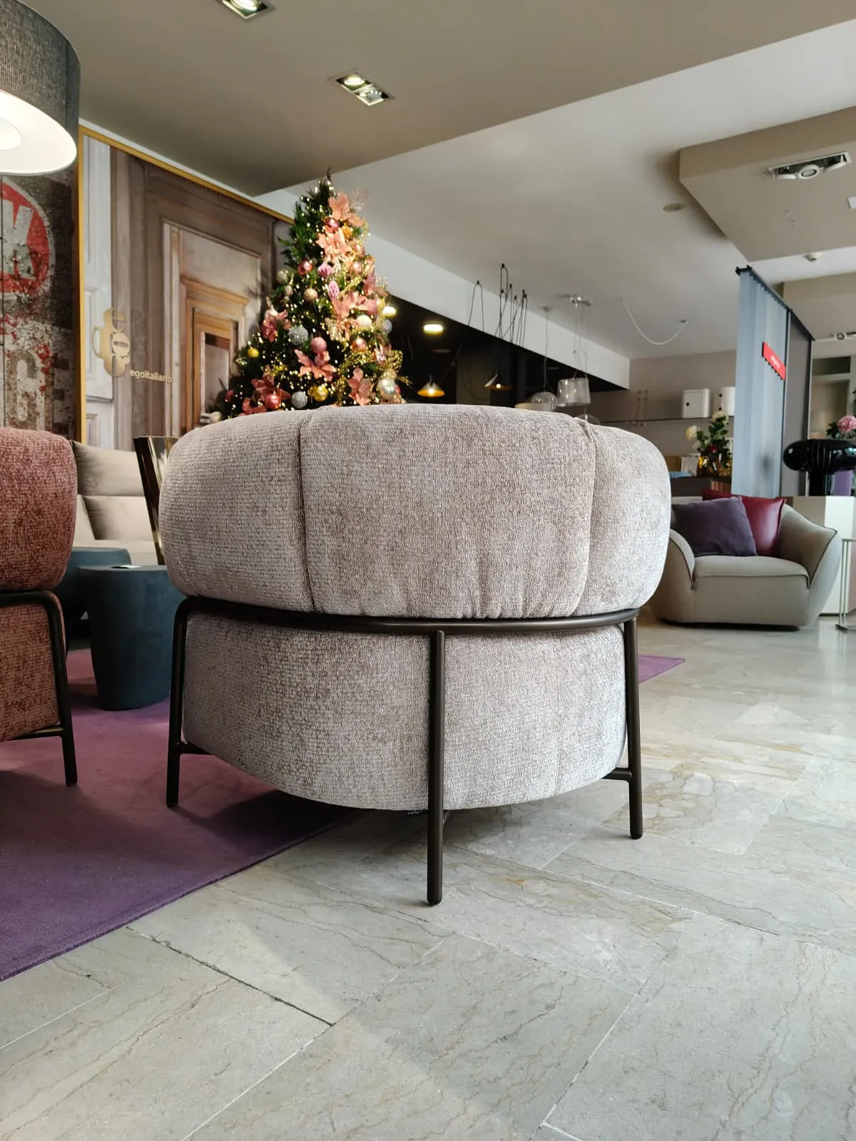 Lo schienale morbido e avvolgente accoglie chi vi si accomoda con una sensazione di protezione, mentre la seduta, sostenuta da una struttura interna con cinghie elastiche, garantisce un comfort duraturo e una piacevole resilienza.