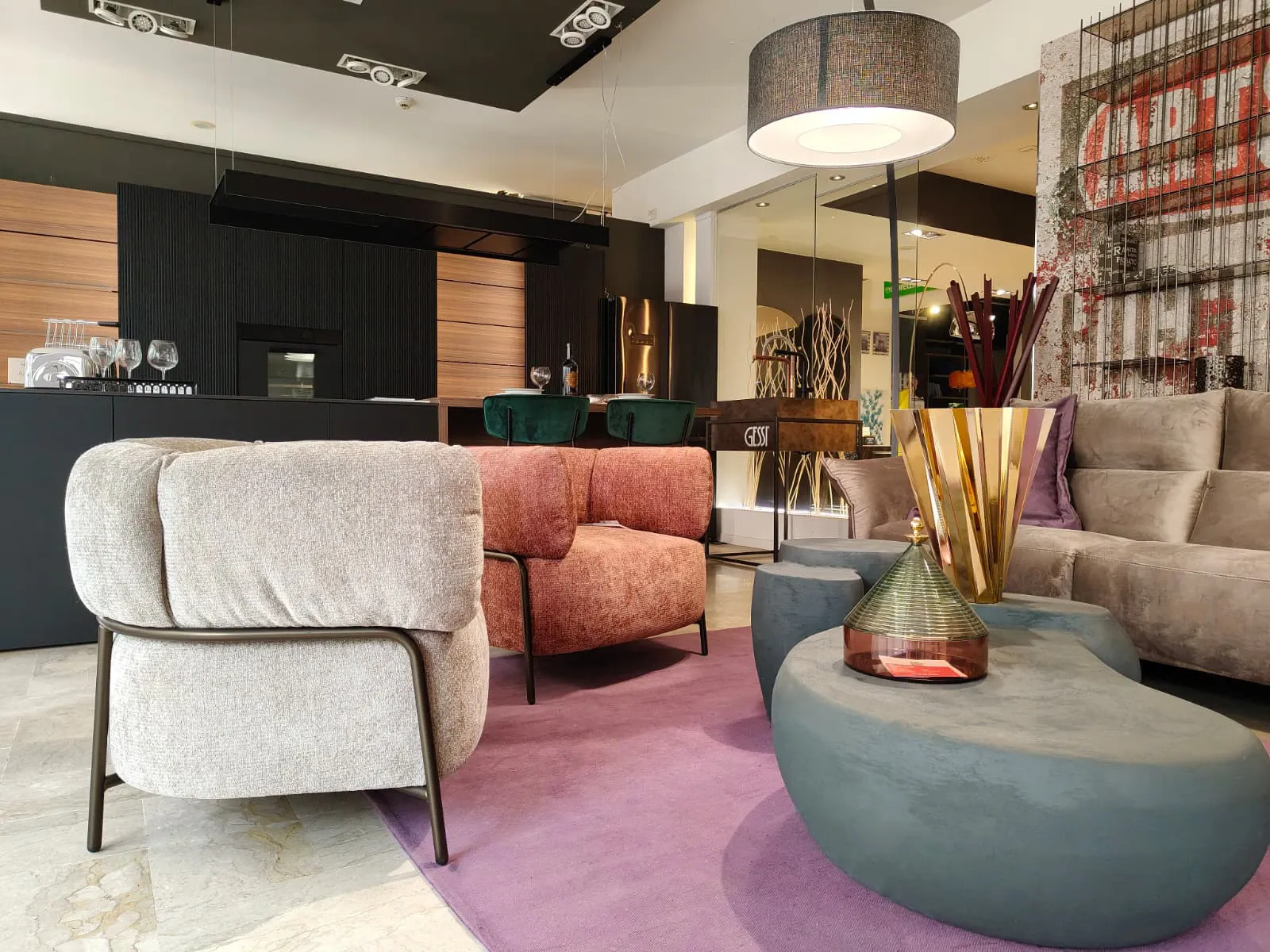 La sua estetica nasce dal gioco di contrasti: linee tese e rigorose si alternano a volumi soffici e generosi, creando un equilibrio che richiama lo stile minimal senza rinunciare a suggestioni mid-century.