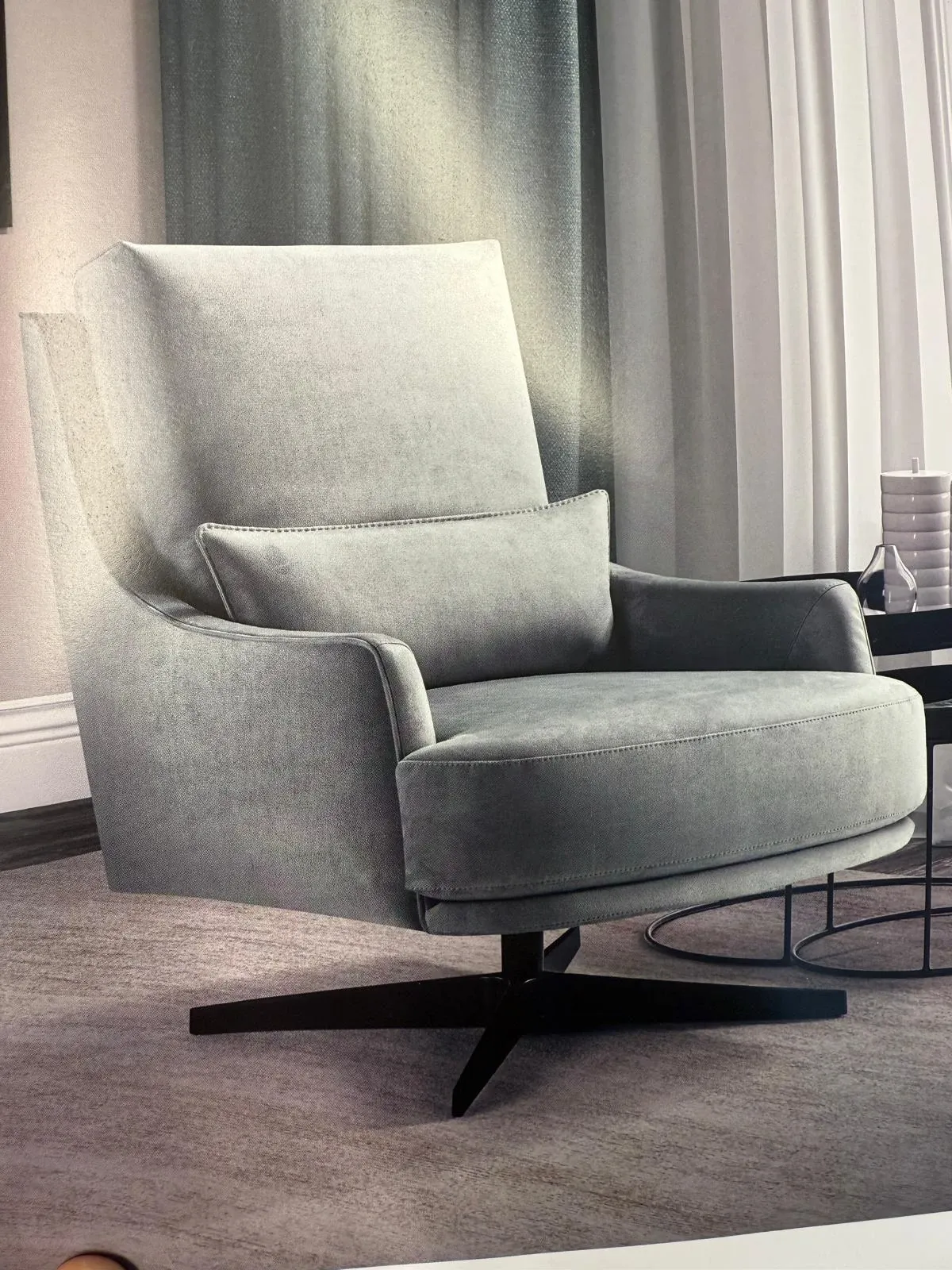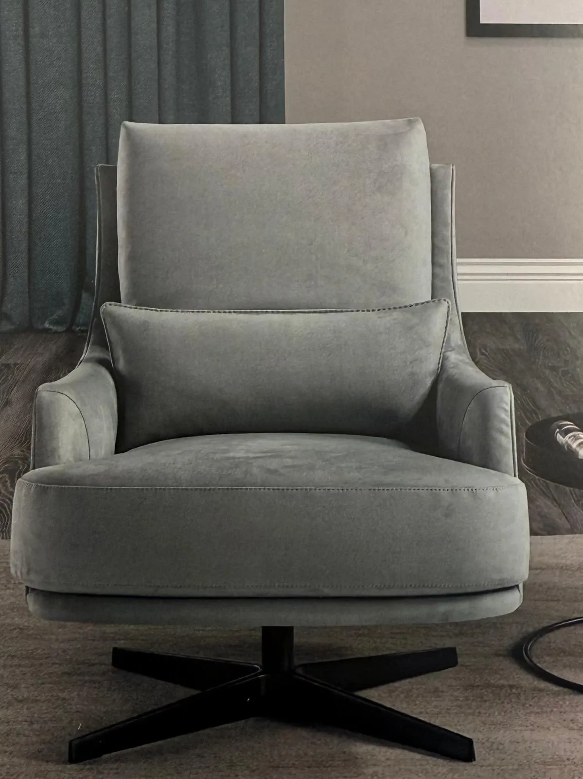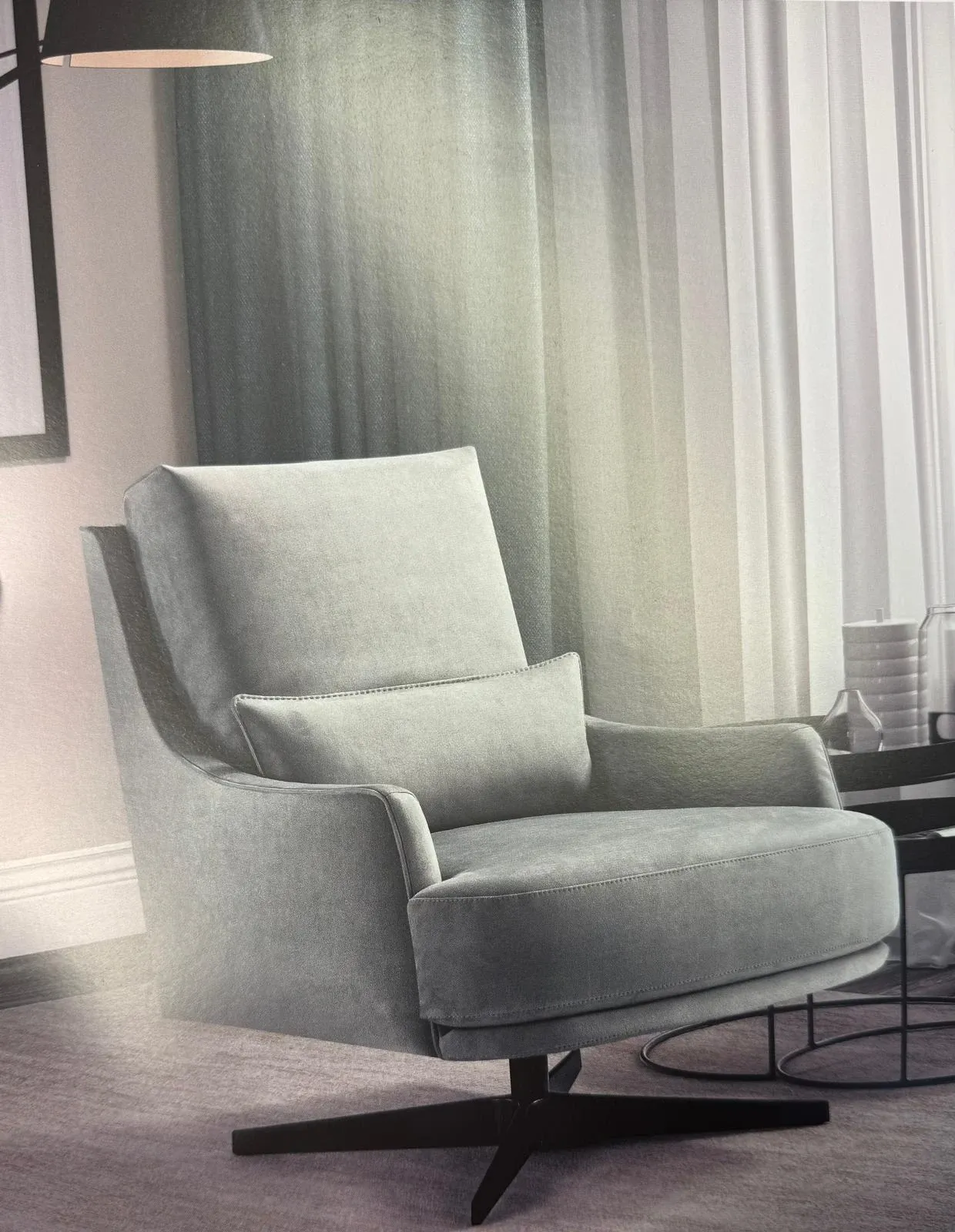 Disponibile con rivestimento in tessuto o in pelle e in tre versioni: su piedi in metallo, girevole o con base in legno e pouf abbinato.
