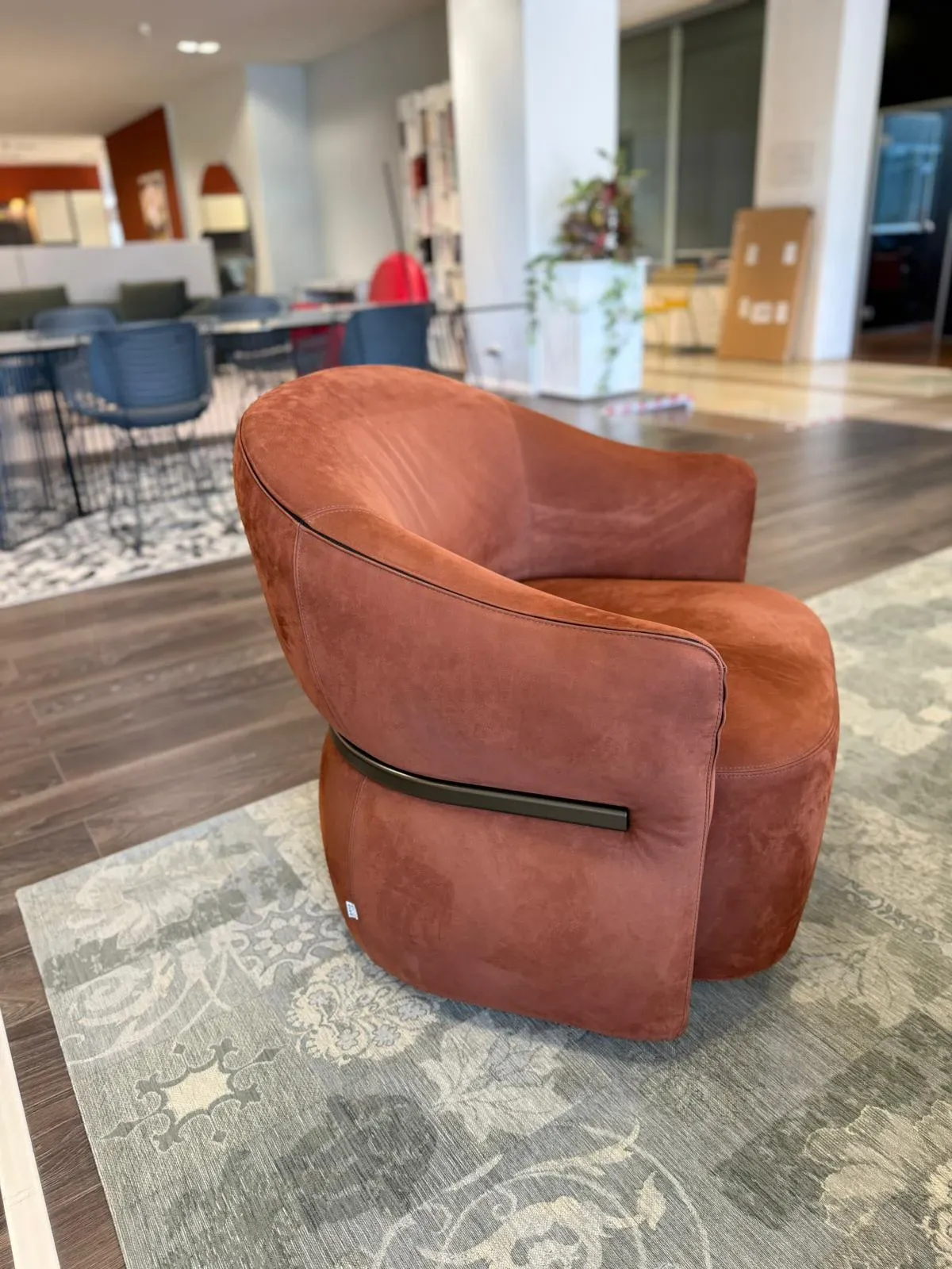Poltrona ispirata alla forma delle ali delle farfalle e da cui nasce il disegno dello schienale: un unico elemento morbido e senza divisioni che offre comfort e il giusto sostegno. Poltrona dalla forma arrotondata, delicata e avvolgente che senza soluzione di continuità include seduta, braccioli e schienale, accoglie il corpo per farci sentire al sicuro. La morbidezza è sottolineata da un tubolare in finitura anodic bronze che racchiude e delimita la parte esterna di schienale e braccioli; un dettaglio identificativo di grande eleganza e armonia e di sicuro effetto decorativo. Rivestimento in pelle completamente sfoderabile. La versione della poltrona è girevole a 360°.