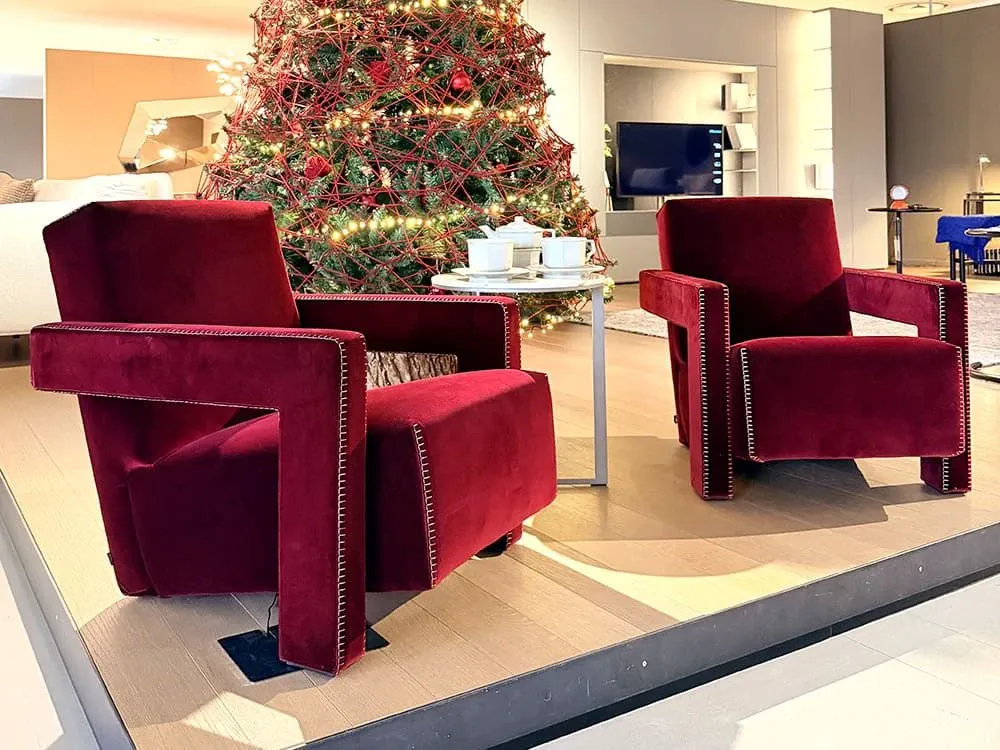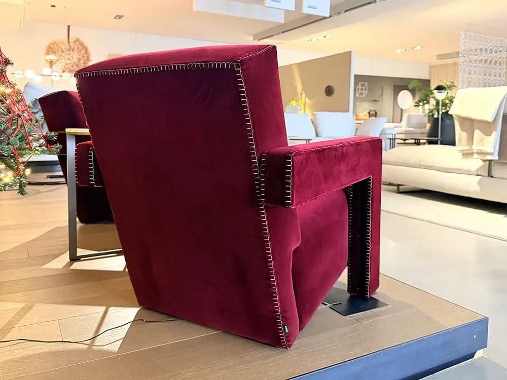 La poltrona Utrecht di Cassina, progettata da Gerrit T. Rietveld nel 1935, nasce come seduta pensata per la produzione in serie, unendo design industriale e comfort secondo i principi del Neoplasticismo. È caratterizzata da forme geometriche essenziali: schienale e seduta appoggiati a terra e braccioli a L rovesciata.