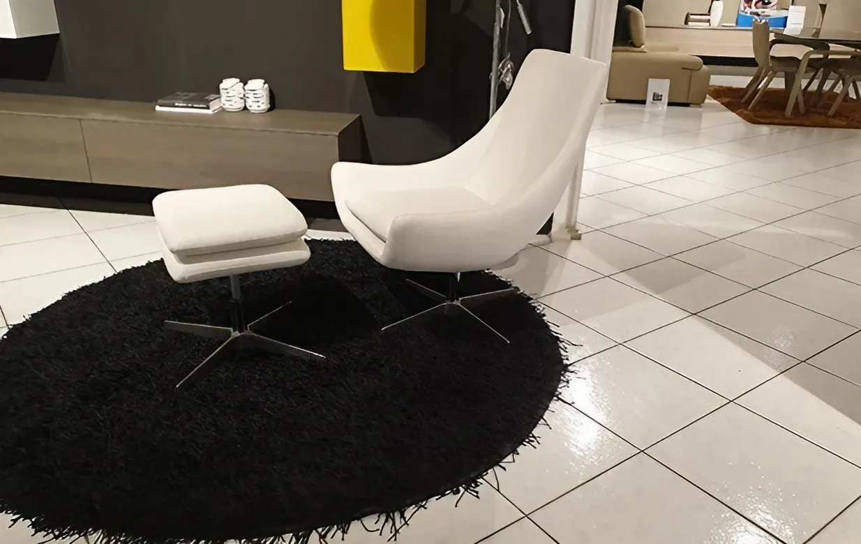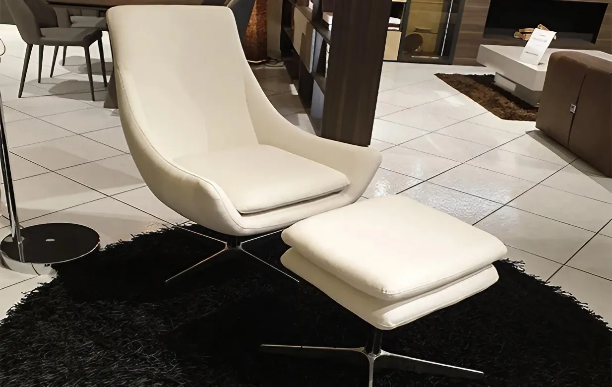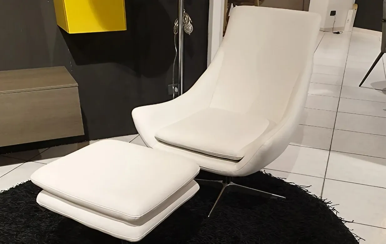 Poltrona girevole e puoff in coordinato, rivestiti in ecopelle bianca e basamento in alluminio finitura cromo.